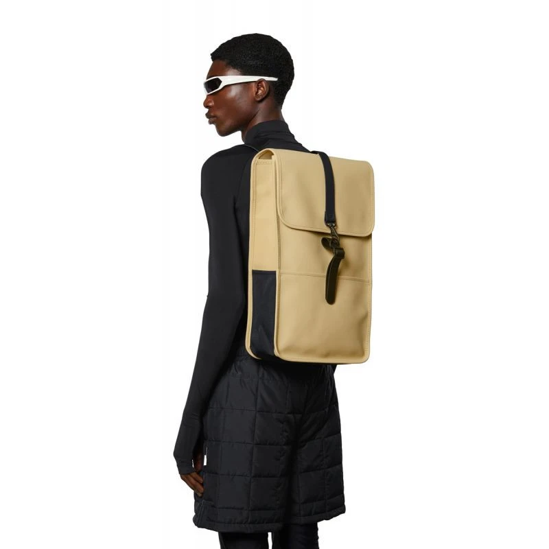 Batoh je vyroben z charakteristické voděodolné PU tkaniny Rains, navržené pro pevnost, odolnost a hladký omak.
