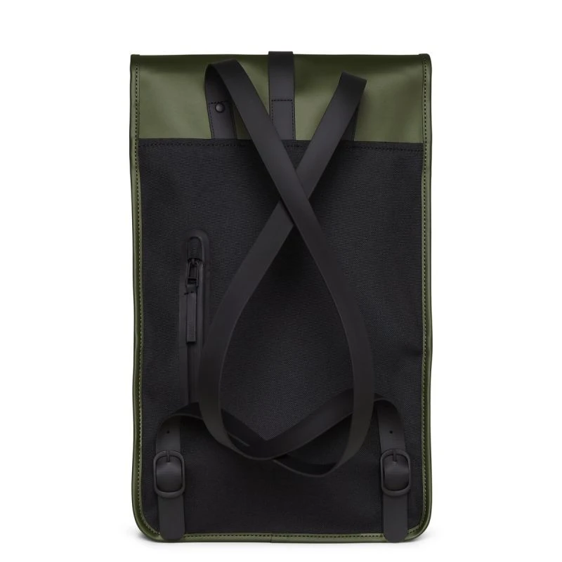 Batoh je vyroben z charakteristické voděodolné PU tkaniny Rains, navržené pro pevnost, odolnost a hladký omak.