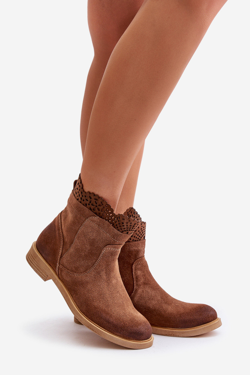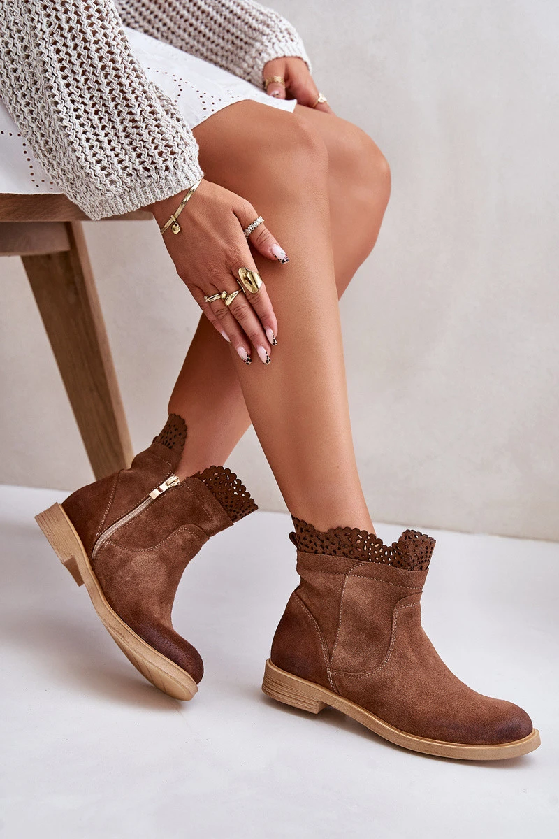 Tyto krásné dámské boty byly vyrobeny z vysoce kvalitního přírodního semiše. Jsou umístěny na plochém podpatku, což je činí nesmírně pohodlnými a stabilními. Zapínají se na zip z boku svršku. Tento model má vyřezávaný prvek na vrcholu svršku. Špičky jsou zaoblené. Určitě bys je měla mít! Při výběru velikosti se řiďte tabulkou velikostí.