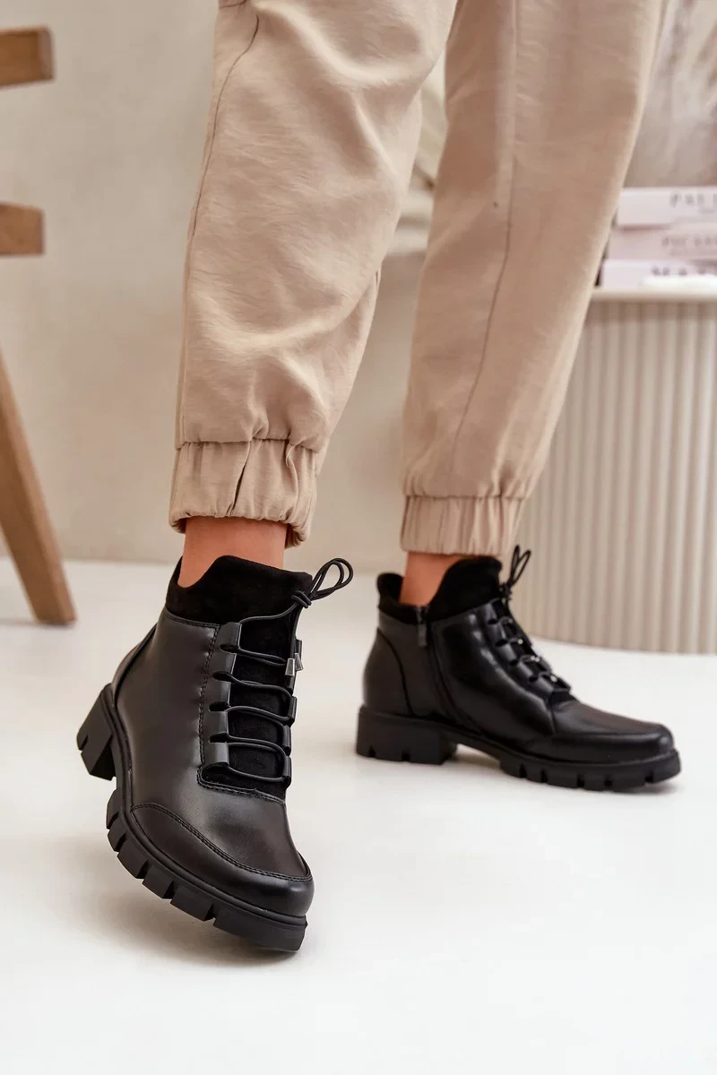 Dámské kotníkové boty od značky Jezzi. Vyrobeno z eko kůže. Nízká holenní část sahající za kotník. Osazené na plochém podpatku. Zapínání na zámek a navíc mají šněrování, což umožňuje ideální přizpůsobení noze. Vnitřek zateplený příjemnou na dotek obuvnickou dekou. Klasický střih pro neformální stylizace! Při výběru velikosti se prosím řiďte tabulkou velikostí.