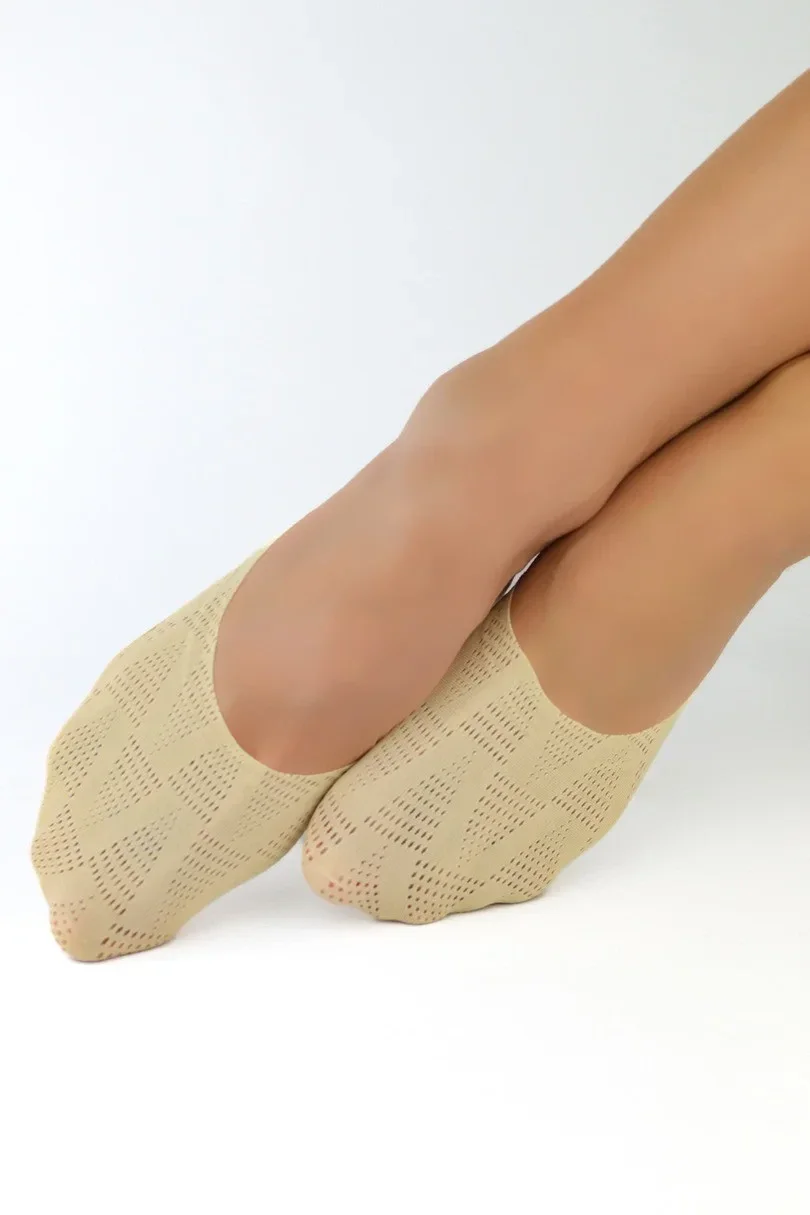 Nízké baleríny SN045 jsou výjimečně stylové a funkční dámské baleríny, ideální pro lehkou obuv. Originální ažurový trojúhelníkový vzor jim dodává elegantní vzhled a zároveň zajišťuje prodyšnost. Díky silikonu kolem chodidla a další silikonové vrstvě na patě zůstávají při nošení na místě a nesklouzávají. Bavlněná podrážka zvyšuje pohodlí a chrání před odřením. Ideální pro baleríny, mokasínyóa další obuv s nízkým svrškem.