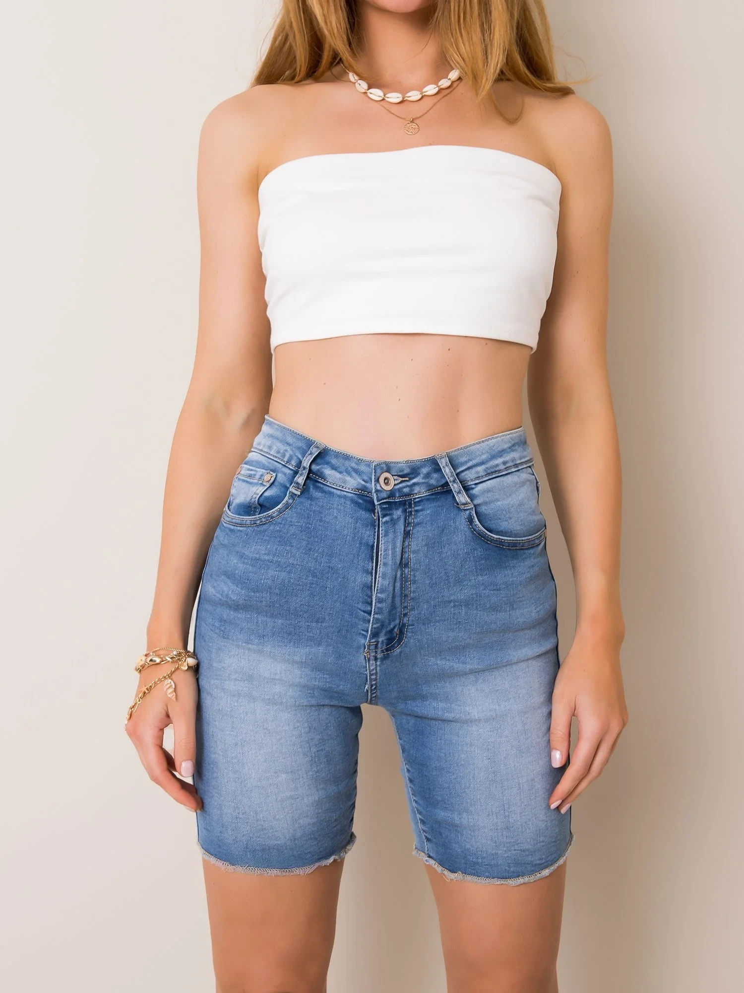Modré džínové bermudy.