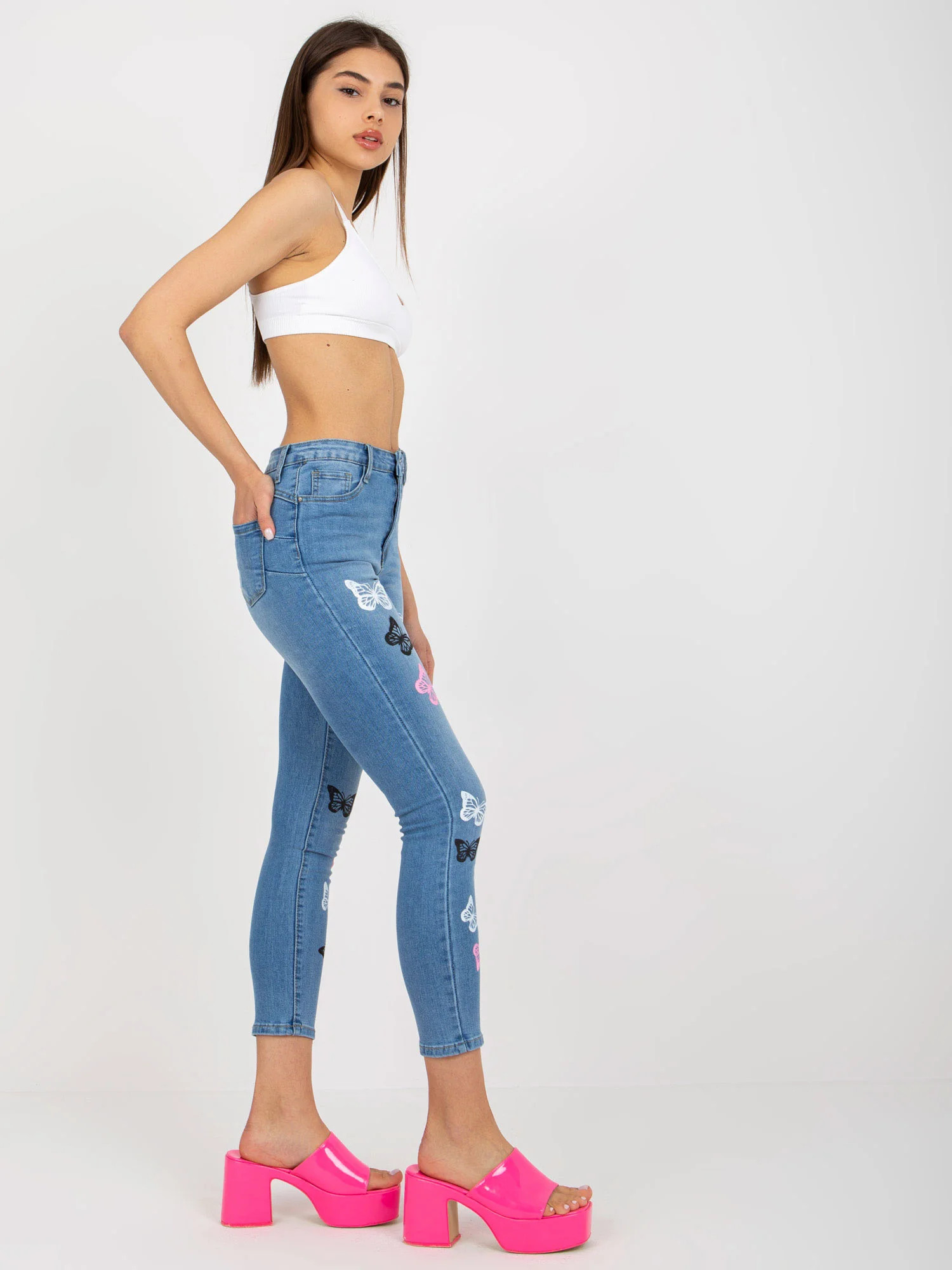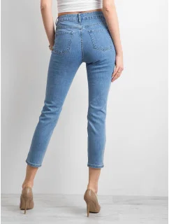 Modré dámské džínové kalhoty s potiskem .