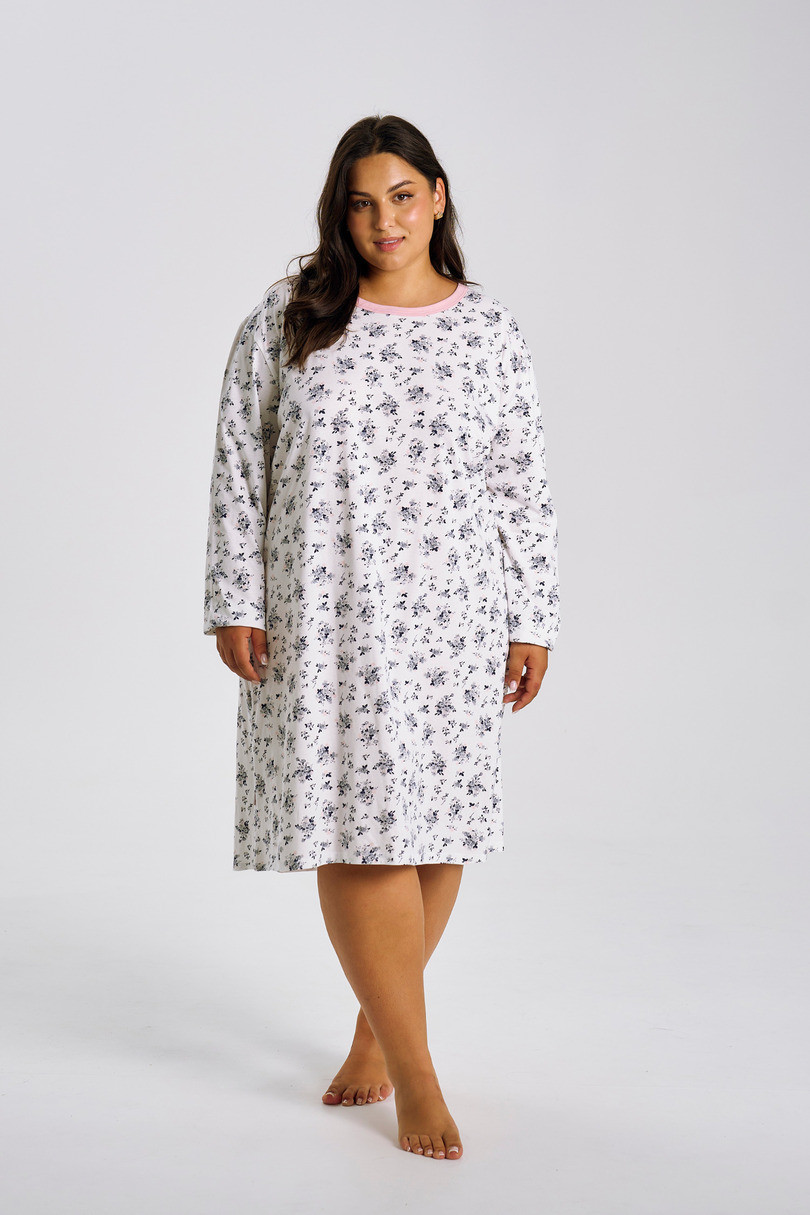 Koszula nocna MARTINA 3467 marki TARO to doskonała propozycja dla kobiet plus size, które cenią ponadczasowy styl i maksymalną wygodę. Uszyta z wysokiej jakości, wzorzystej bawełny, zapewnia naturalną przewiewność, komfort termiczny i miękkość w dotyku. Model z długim rękawem, okrągłym dekoltem starannie wykończonym lamówką oraz długością do kolan idealnie sprawdzi się przez cały rok. Luźny krój gwarantuje swobodę ruchów i pełen relaks podczas snu i wypoczynku.