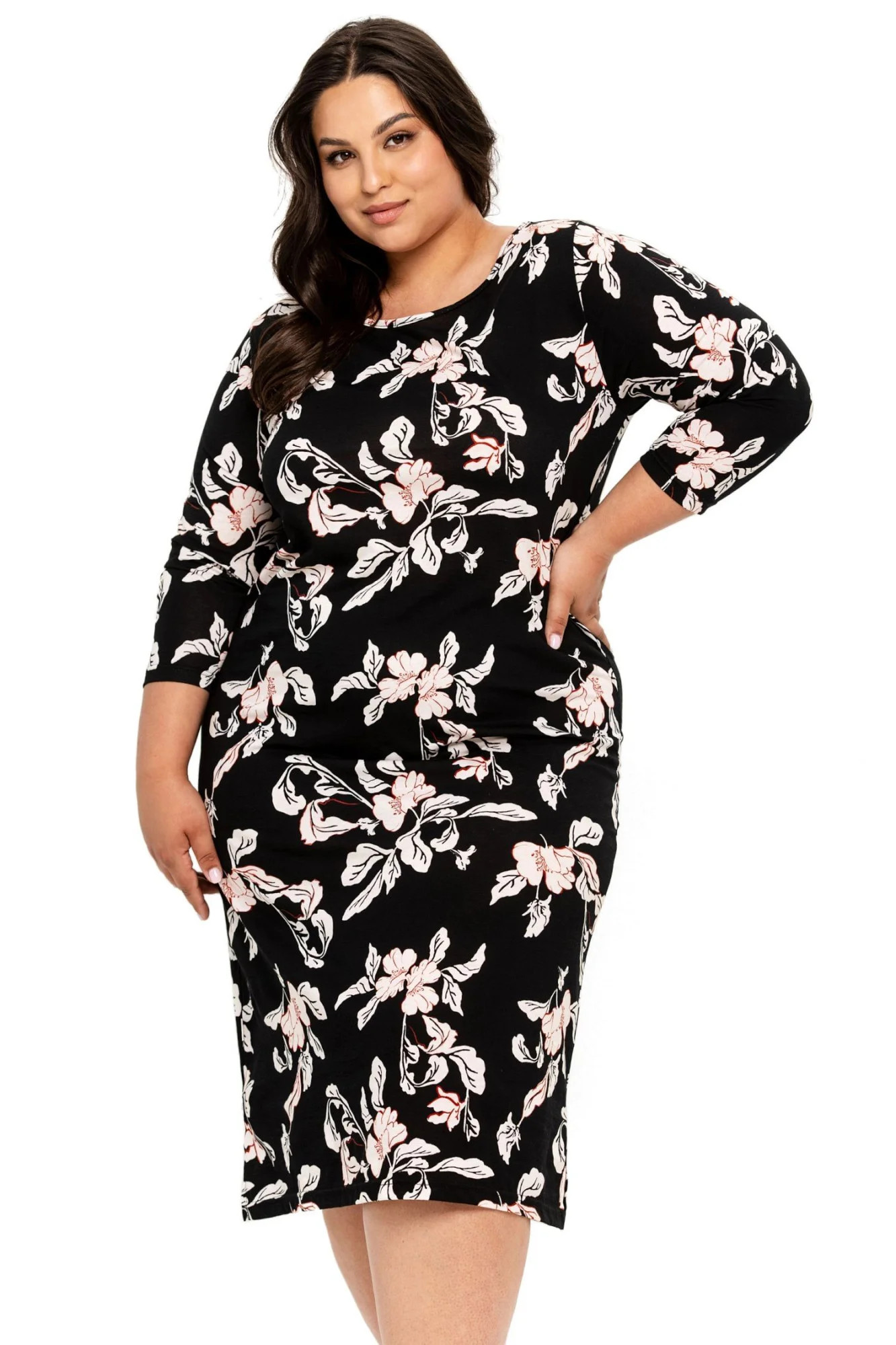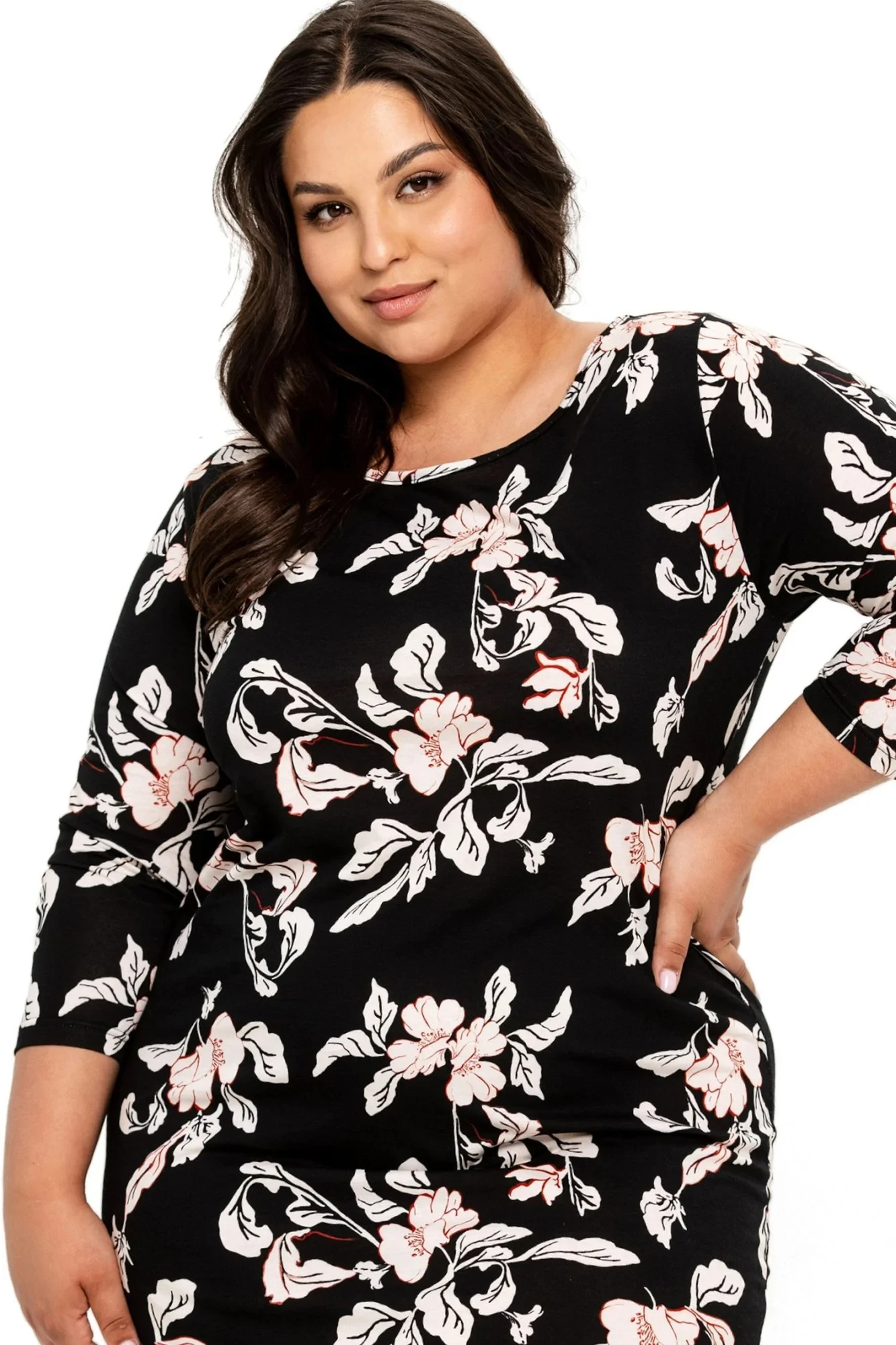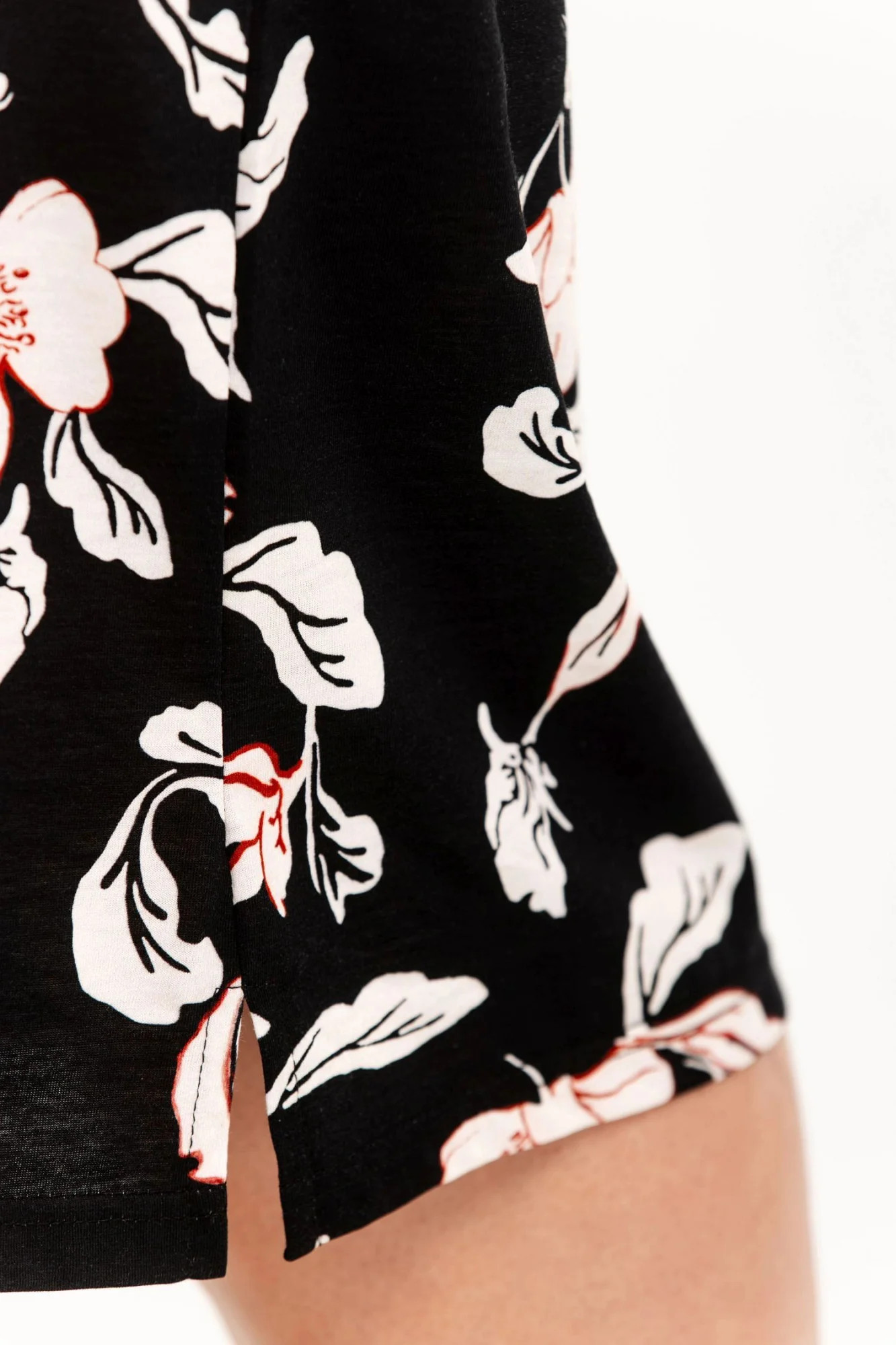 Dámská košile s 3/4 rukávy z bavlny s květinovým vzorem. Délka ke kolenům, jemné řasení, kulatý výstřih.