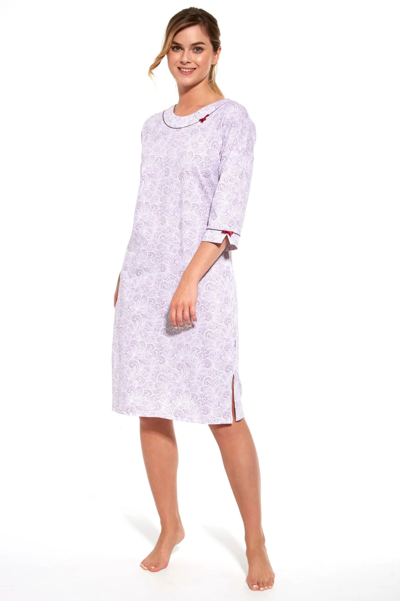 Noční košile 734/325 Stella 2 plus CORNETTE - fialová barva - vyrobeno z kvalitní vzorované bavlny - tříčtvrteční rukávy - výstřih a manžety lemované saténovou mašlí - délka nad kolena
