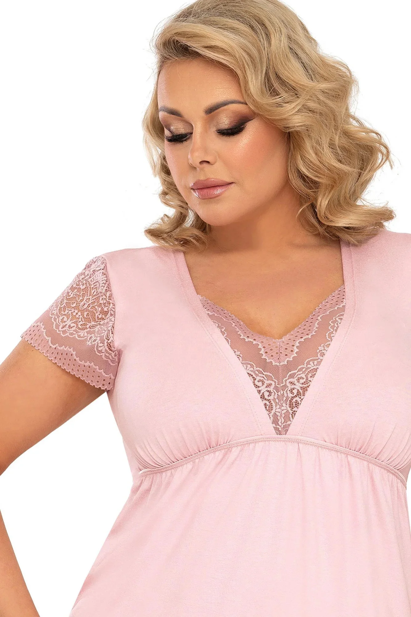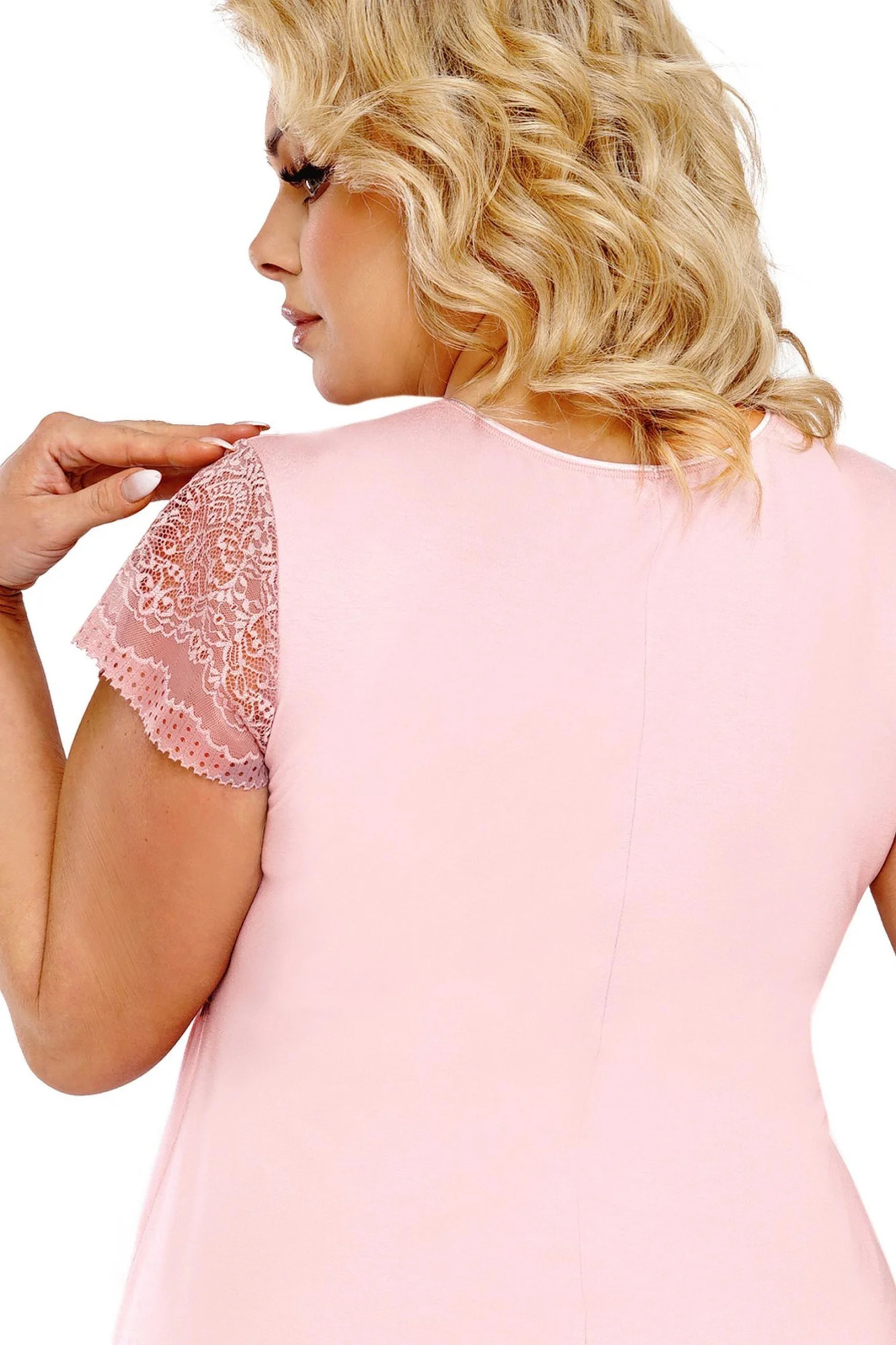 Noční košile Celine plus Donna - růžová barva - vyrobená z velmi kvalitní viskózy - výstřih zdobený krajkou - krátké rukávy z efektní krajky - pod košíčky gumička