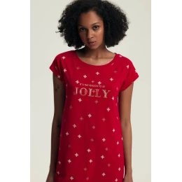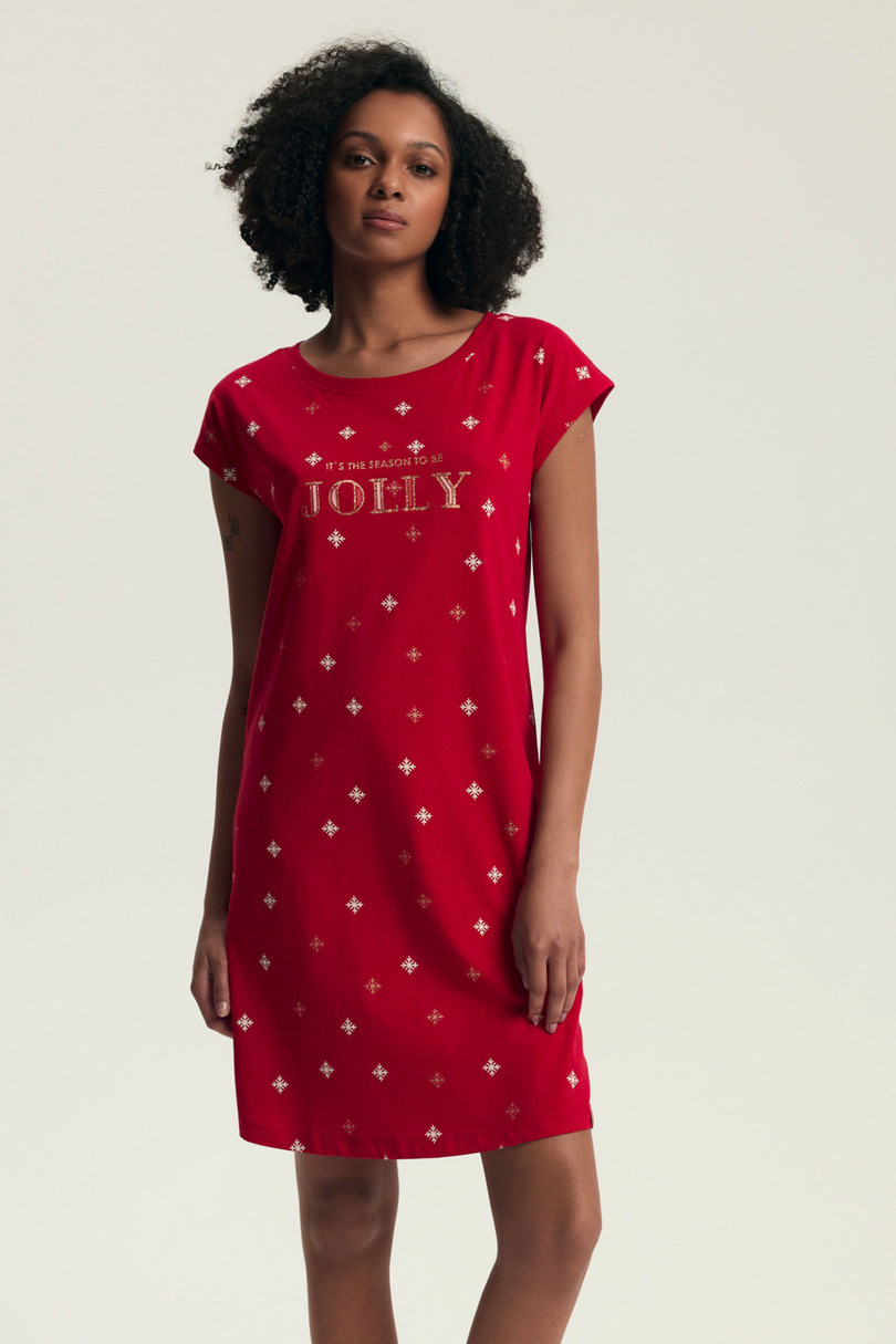 Klasyczny, prosty krój z krótkim rękawem sprawia, że model ten doskonale dopasowuje się do każdej sylwetki. Świąteczny nadruk z napisem „It’s the season to be JOLLY” oraz złote, błyszczące elementy graficzne w postaci śnieżynek nadają koszuli wyjątkowego, radosnego charakteru.
