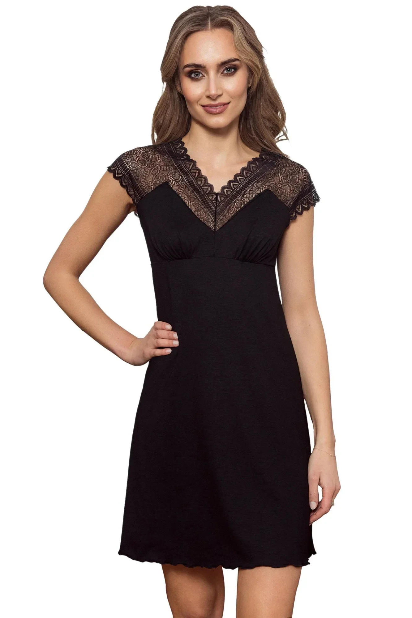 Noční košile Margaret plus ELDAR - černá barva - z vysoce kvalitní viskózy - krátké krajkové rukávy - horní část z krajkové aplikace