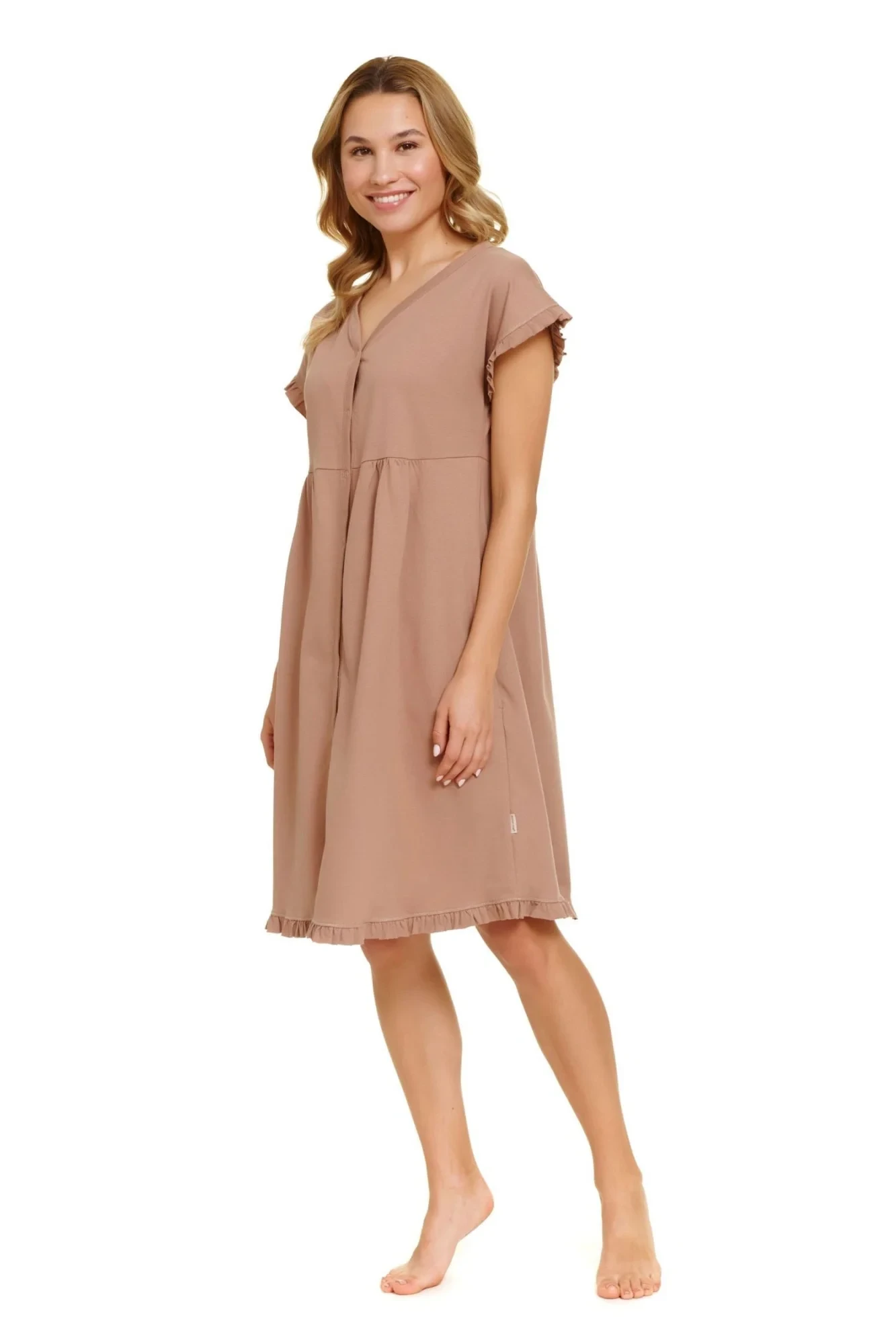 Dámská noční košile 9600 Doctor Nap - vyrobená z velmi kvalitní a příjemné organické bavlny - hnědá barva s krátkými rukávy - zakončené volánky - zapínání na knoflíky - ideální pro těhotné a kojící - na bocích kapsy - certifikát OEKO-TEX Standard 100