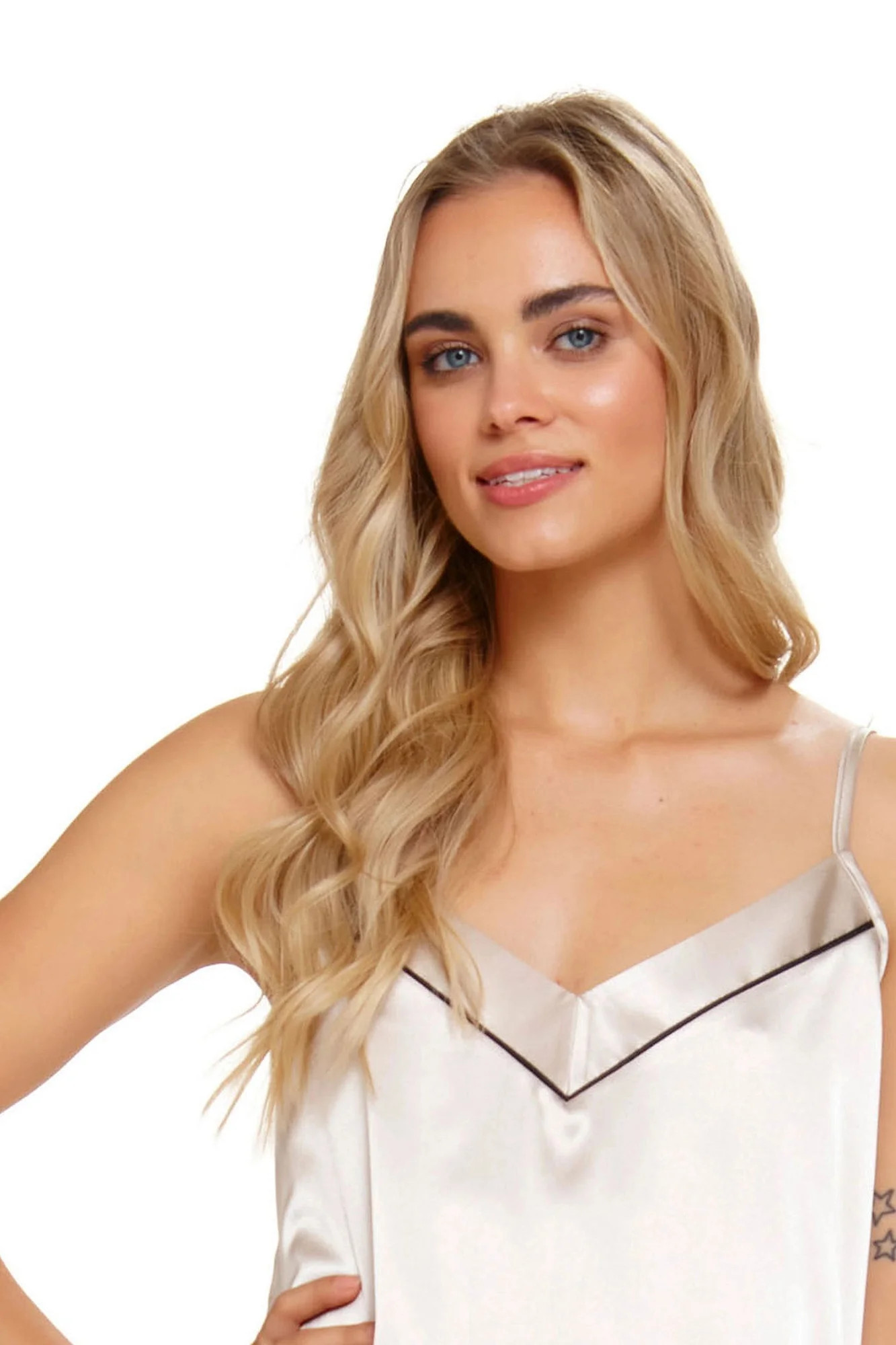 Noční košile 5226 Doctornap - krémová barva - vyrobená z velmi kvalitního a příjemného saténu - s úzkými ramínky - výstřih ve tvaru písmene "V"