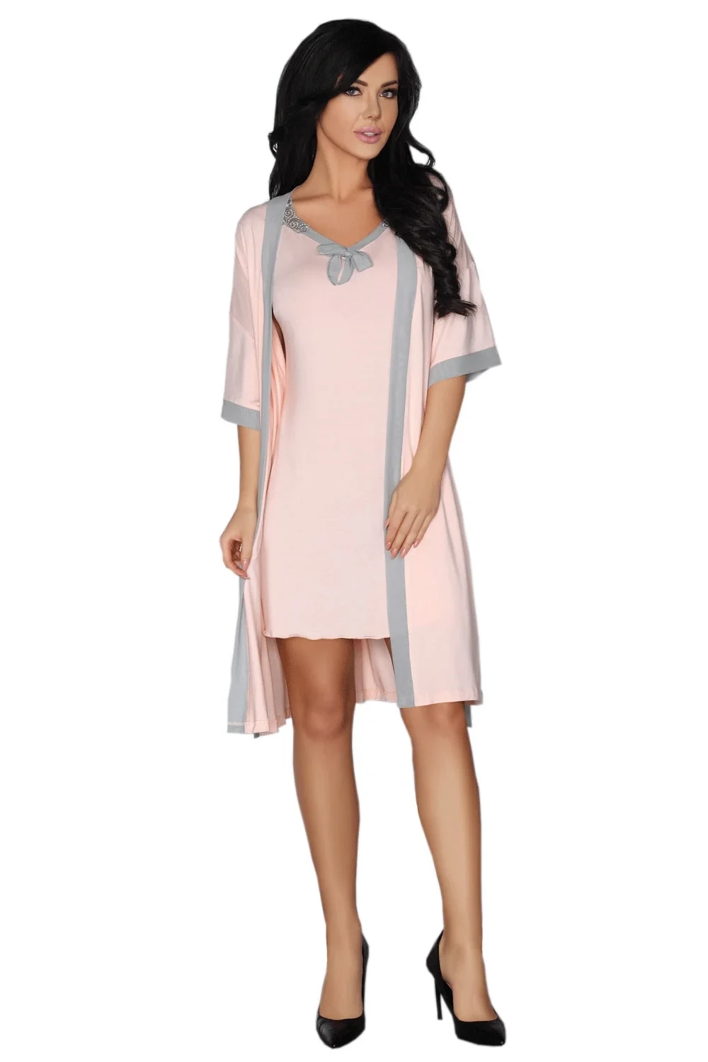 Dámská noční košilka Moem LivCo - z příjemné velmi kvalitní růžové bavlny - s širokými ramínky z šedé výšivky - kontrastní lemování - dekolt ozdobená šedou mašlí - součástí košile jsou tanga