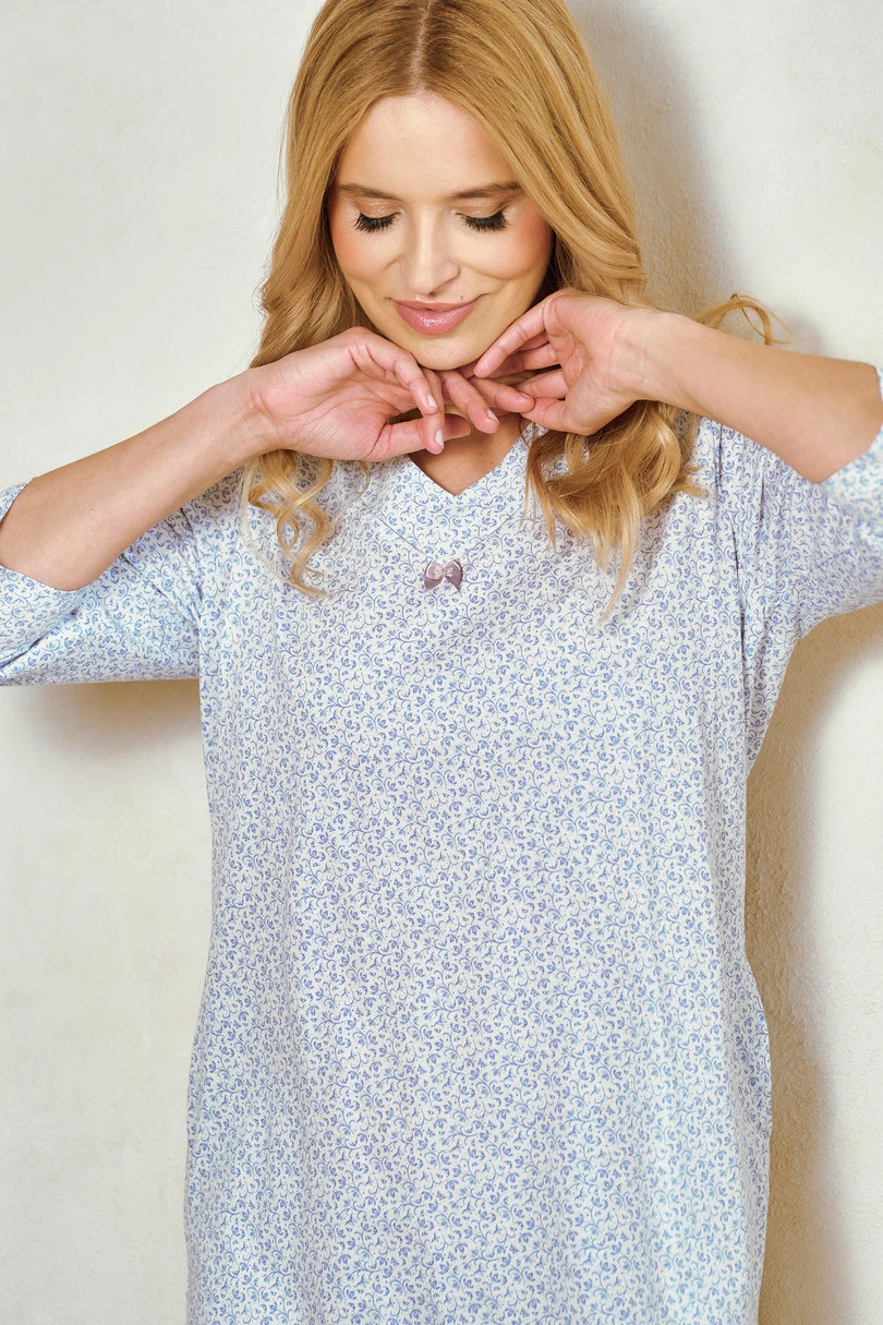 Noční košile Debora 3449 značky Taro je dokonalou kombinací pohodlí, praktičnosti a ženského stylu. Je vyrobena ze 100% kvalitní bavlny a poskytuje měkkost, prodyšnost a pohodlí po celou noc. Model má rukávy s délkou 7/8, výstřih do „V” a praktické kapsy, které přispívají k jeho funkčnosti. Díky délce ke kolenům je košile ideální po celý rok, ideální na spaní i domácí odpočinek.