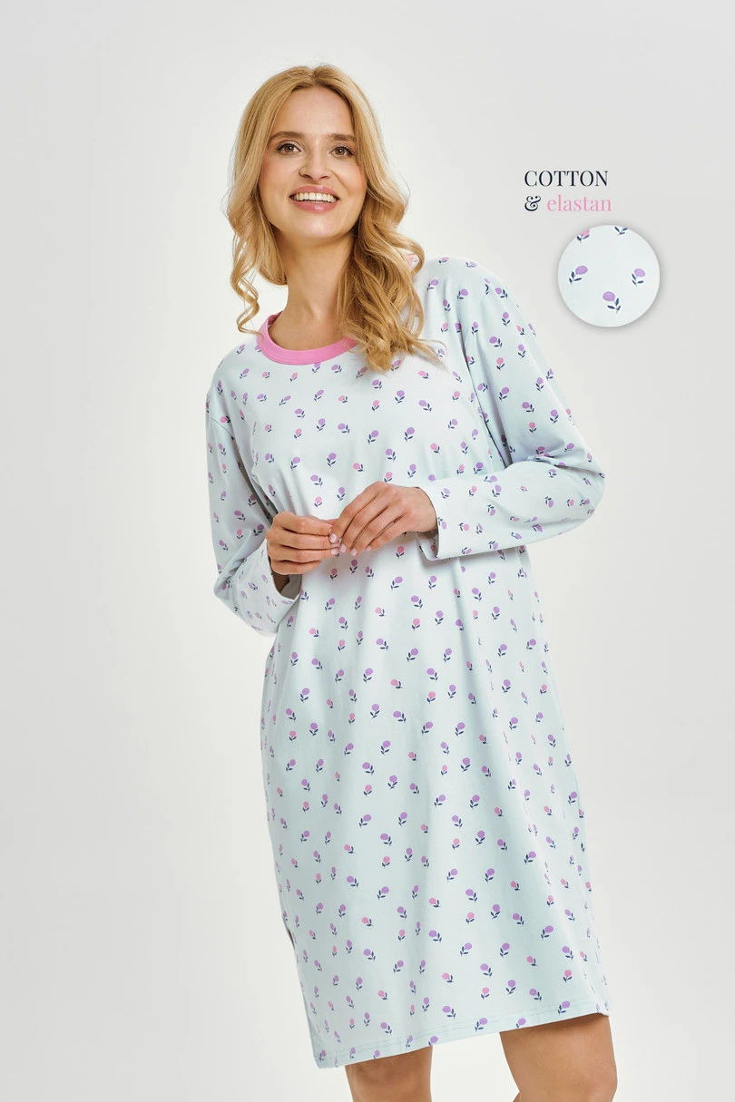 Dámská noční košile Yolanda 3447 od značky Taro v sobě spojuje pohodlí a jemnou eleganci. Je vyrobena z měkkého a pružného úpletu – 94 % bavlny s elastanem – zajišťuje dokonalé padnutí a plnou volnost pohybu. Díky dlouhým rukávům se skvěle hodí na chladnější večery a výstřih zdobený kontrastním lemováním – dodává jedinečný charakter. Barevný potisk oživuje střih a podtrhuje ženský styl.