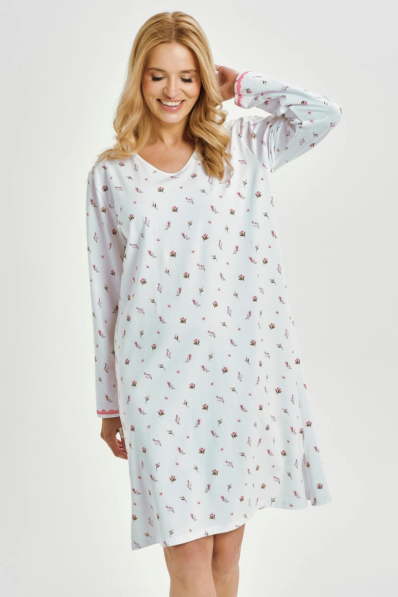 Noční košile ELODIE 3433 je klasickou volbou pro ženy, které chtějí spojit pohodlí při spánku s ženským půvabem. Je vyrobena z vysoce kvalitní 100% bavlny, která zaručuje měkkost a prodyšnost. Dlouhé rukávy a výstřih do V zajišťují pohodlné nošení, zatímco délka ke kolenům s praktickými bočními rozparky zvyšuje volnost pohybu. Květinový vzor dodává košili romantický nádech a zpříjemňuje každou noc.
