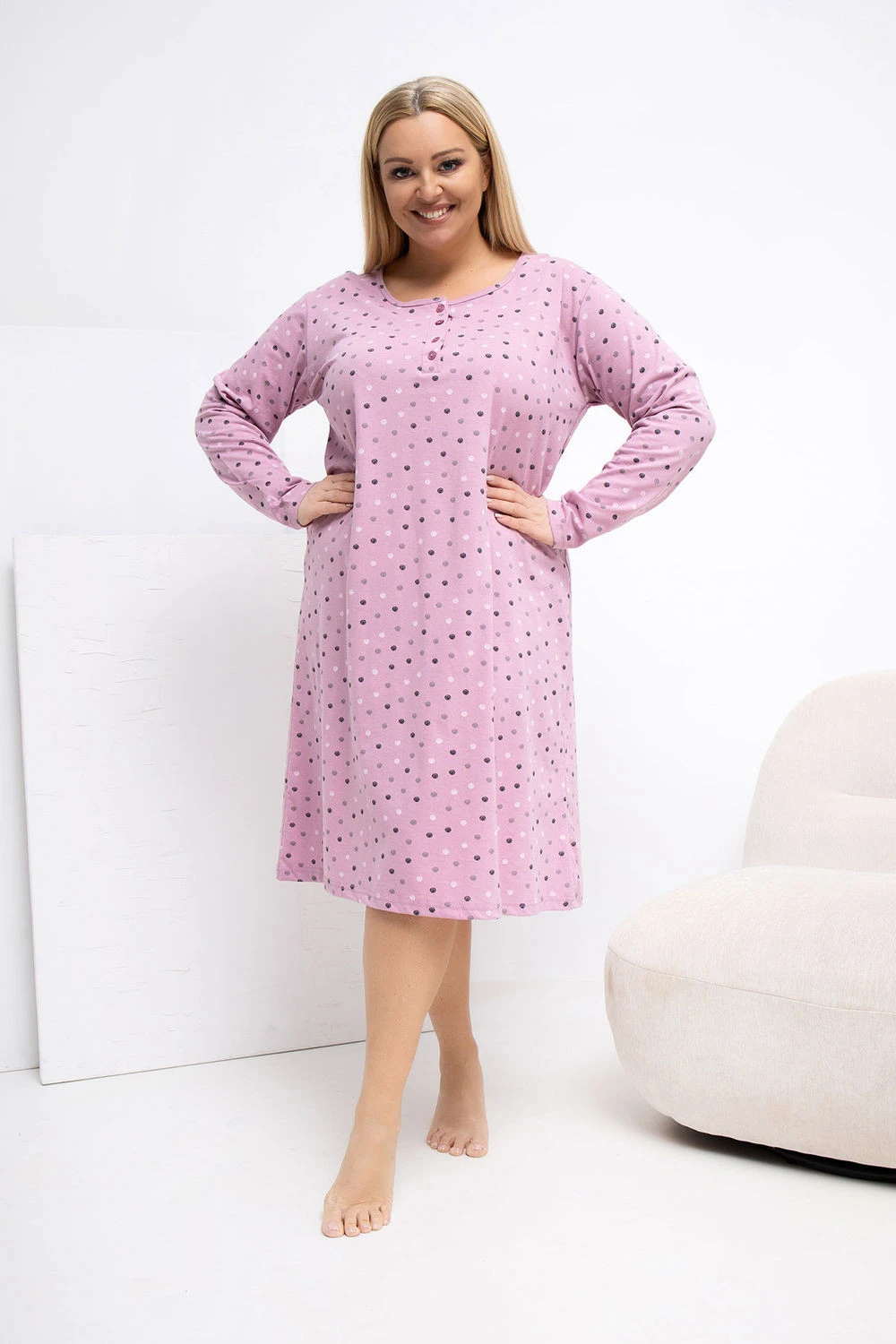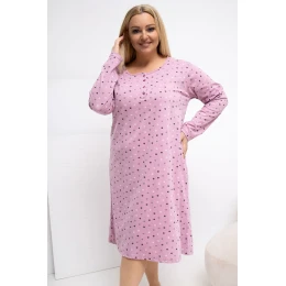 Pohodlná a stylová noční košile plus size, ve které dominují roztomilé puntíky, které dodávají lehkost a ženský charakter. Model je vyroben převážně z měkké, příjemné bavlny, což zaručuje pohodlí během spánku a pohodlí nošení. Košile má klasický, kulatý výstřih a dlouhé rukávy, které chrání před chladem. V přední části jsou umístěny čtyři decentní knoflíky, které přidávají jemný detail a usnadňují oblékání. Délka po kolena dělá košili elegantní a volnou zároveň. Absence zapínání dodává modelu lehkost a jednoduchost, ideální pro relaxaci doma.