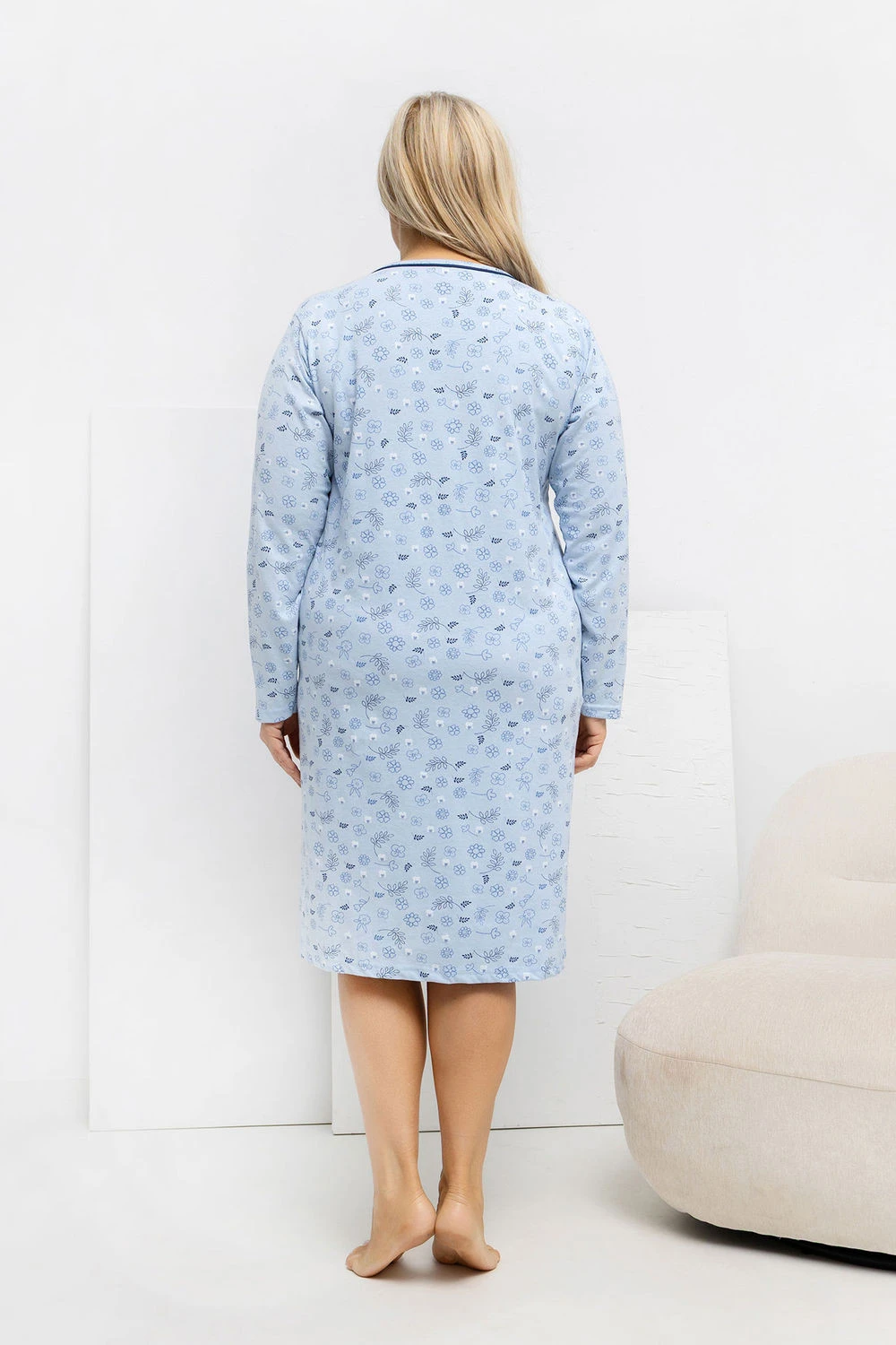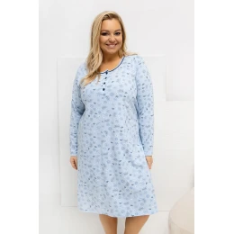 Pohodlná noční košile plus size v jednoduchém, šatyovém střihu, kombinující pohodlí s ženským stylem. Vzor dominující ve formě jemných květů dodává celku jemnou lehkost a půvab. Model je vyroben převážně z měkké, příjemné bavlny, která zajistí pohodlný spánek a volnost pohybu. Košile má klasický, kulatý výstřih a dlouhé rukávy, které chrání před chladem. V přední části jsou čtyři knoflíky, které přidávají elegantní detail a usnadňují oblékání. Délka nad kolena dělá košili jak pohodlnou, tak stylovou, ideální pro relaxaci doma.