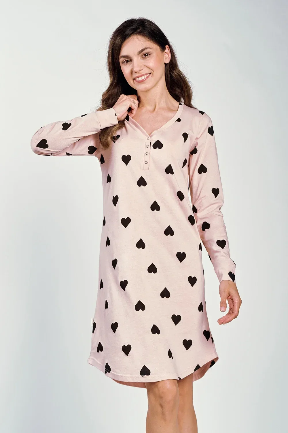Noční košile, která kombinuje eleganci a pohodlí a je ideální pro každou noc. Má výstřih do V a volný, pohodlný střih pro volnost pohybu. Je vyrobena z měkké tkaniny s potiskem. Model má polopřiléhavý lem, dlouhé rukávy a praktické zapínání na patentky v úrovni prsou. Košile je zabalena v elegantním pouzdře, což z ní činí ideální nápad na dárek. Polský výrobek, který kombinuje styl a funkčnost, poskytuje výjimečné pohodlí každou noc.