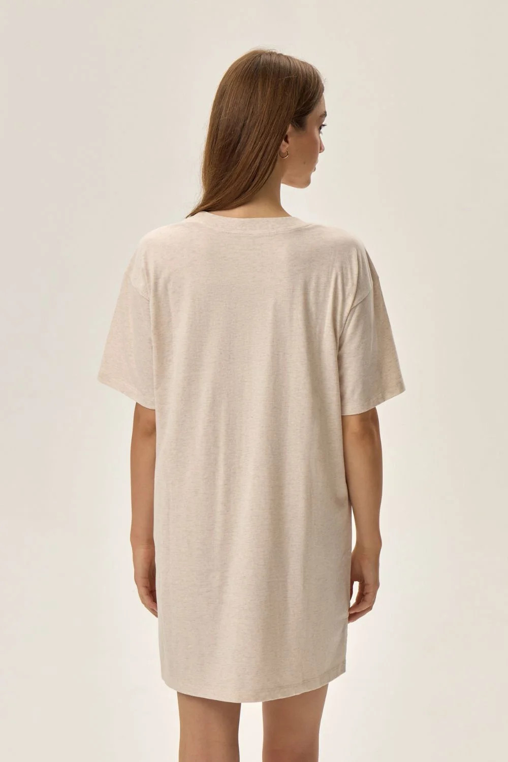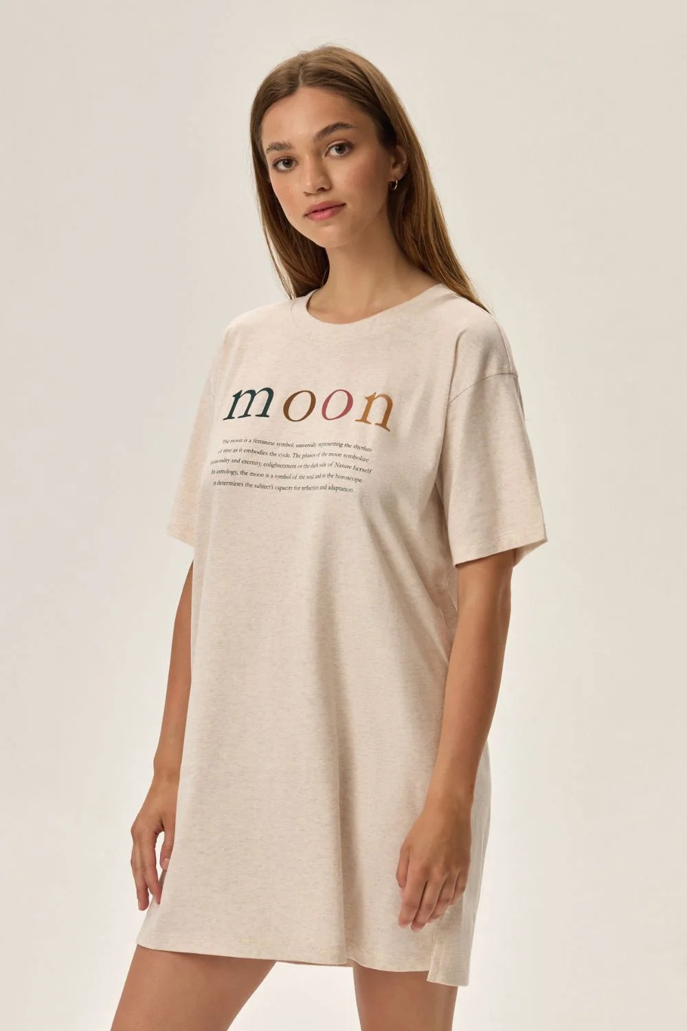 Máte rádi kosmické a astrologické motivy? Zamilujete si noční košili Fune, kterou zdobí barevný nápis Měsíc a stručný popis Měsíce, to vše na jemném béžovém pozadí. Jedná se o klasické šaty na spaní s tričkovým střihem: volné a s krátkým rukávem. Byl vyroben z příjemného úpletu, který zajišťuje pohodlí po celou noc.