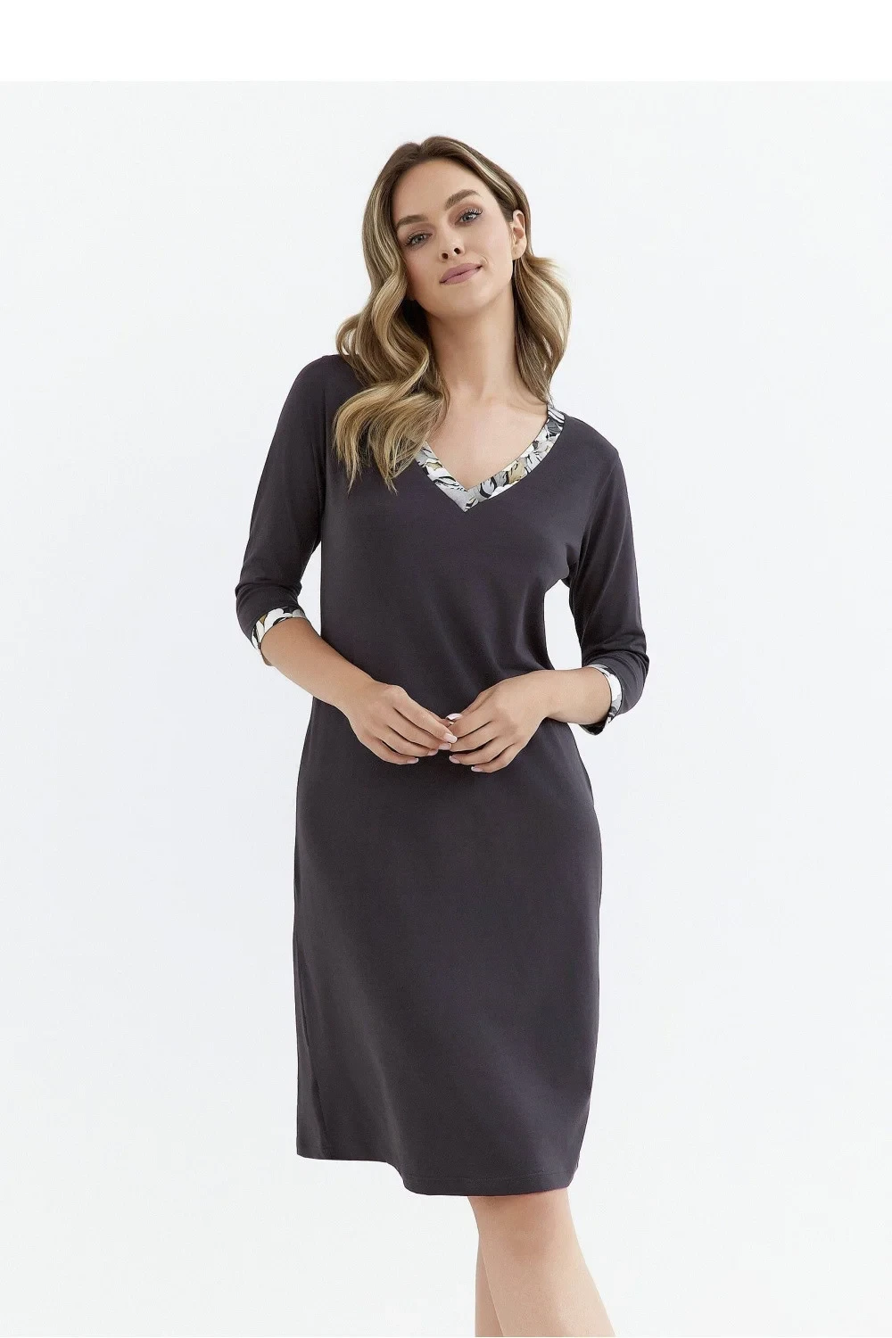 Dámská noční košile s 3/4 rukávem je kombinací pohodlí a jemné elegance. Vyrobená z hladké, příjemné látky, poskytuje pohodlí a volnost po celou noc. Výstřih ve tvaru písmene V, zakončený jemným lemováním, dodává ženský šarm. Volný, pohodlný střih neomezuje pohyby, což dělá košili ideální jak pro spaní, tak pro domácí relaxaci. Zabaleno v praktickém fóliovém sáčku, je také skvělým dárkem.