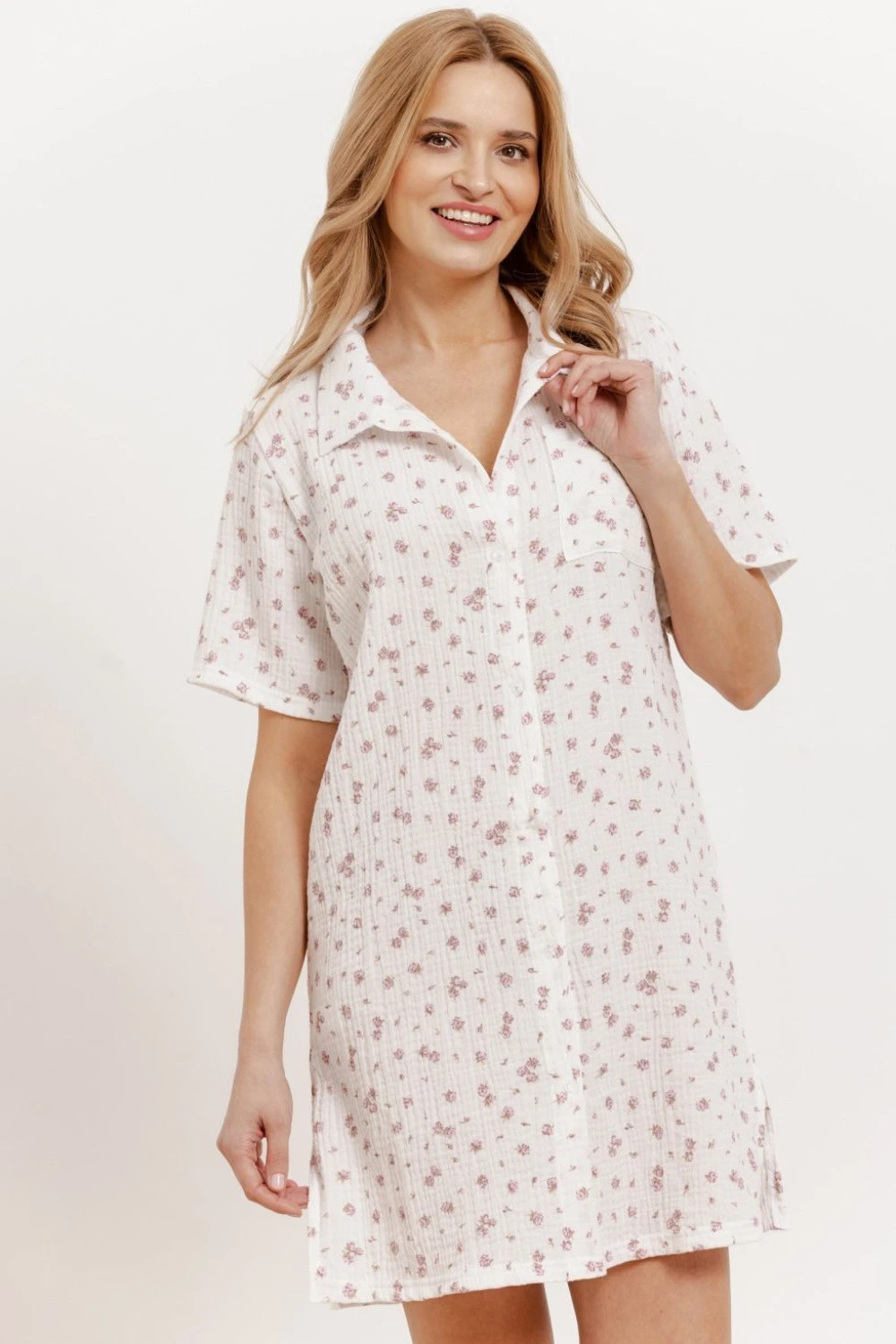 Noční košile do poloviny stehen, vyrobena z měkkého a pohodlného materiálu, který poskytuje volnost pohybu. Model s krátkým rukávem, s klasickým límcem a zapínáním na knoflíky, kombinuje funkčnost s elegantním stylem. Jemná kapsa na úrovni hrudníku a decentní vzor dodávají košili šarm. Rozparky po stranách zvyšují pohodlí nošení, a celý kus je balen v praktickém fóliovém sáčku, ideální jako dárek nebo pro domácí relaxaci.