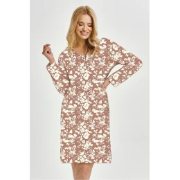 Noční košile dlouhá po kolena, vyrobená z měkkého materiálu s jemným potiskem. Model s dlouhým rukávem a volným, pohodlným střihem zaručuje volnost pohybu a pohodlí během celé noci. Horní část se zapíná na knoflíky, co usnadňuje oblékání a dodává celku jemný, klasický charakter. Košile je balena v praktickém fóliovém sáčku, ideální jak pro každodenní použití, tak jako dárek.