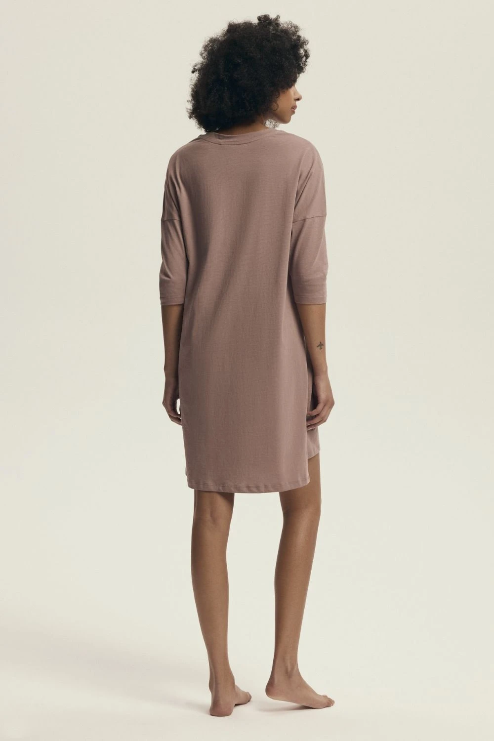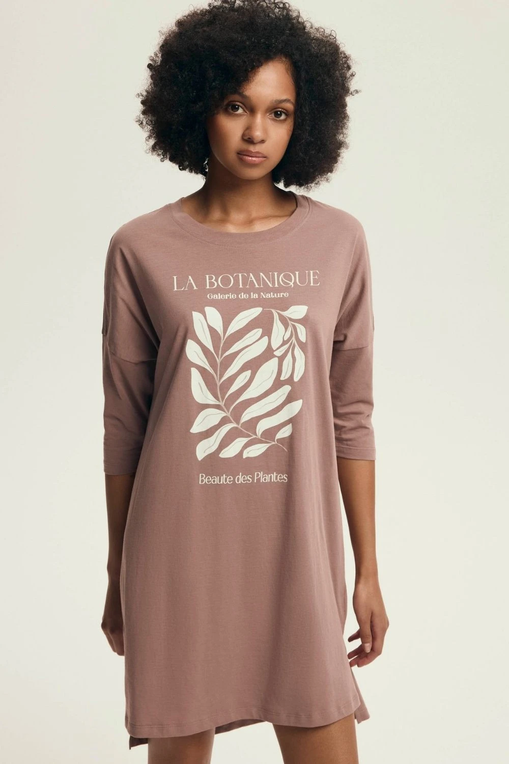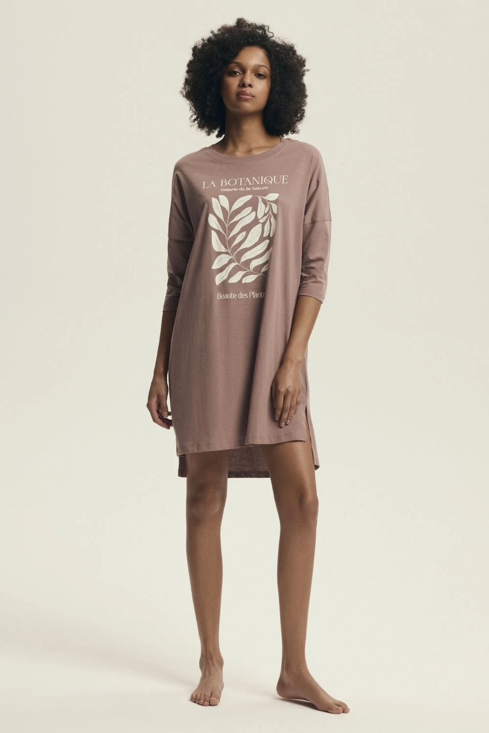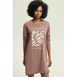 Dámská noční košile v uvolněném, pohodlném střihu, vyrobena z měkkého a prodyšného pletiva, které poskytuje pohodlí a volnost pohybu během spánku. Model s délkou před koleno a mírně delším zády vypadá žensky a lehce. Košile má kulatý výstřih, 3/4 rukávy a jemné rozeklání po stranách, které jí dodávají lehkost a pohodlí nošení. Dekorativní potisk dodává celku decentní charakter. Baleno v praktickém fóliovém sáčku, ideální volba pro ženy, které ocení styl a pohodlí v domácím provedení.