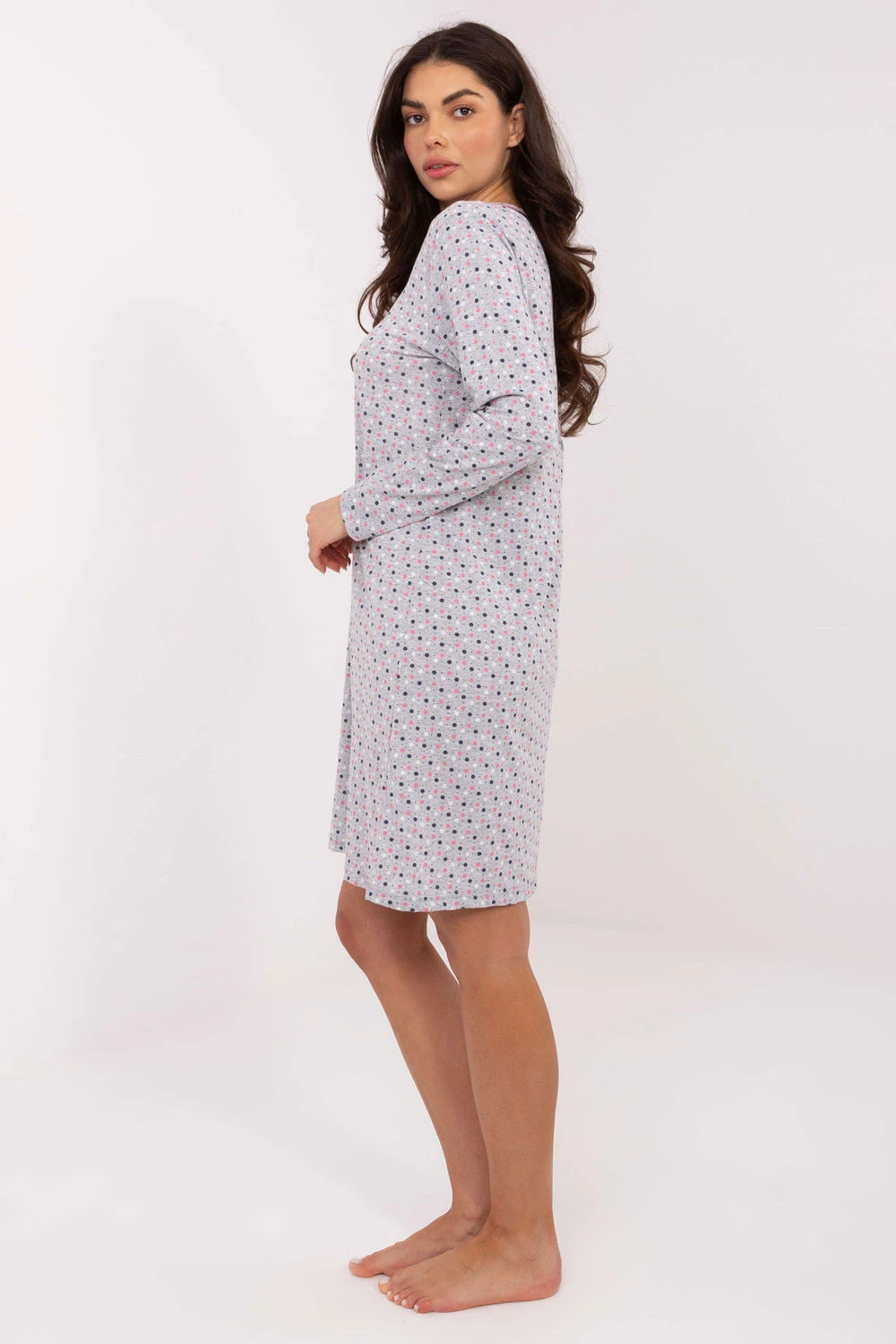 Noční košile vyrobená z bavlny, která poskytuje měkkost, prodyšnost a plný komfort během spánku. Model se vyznačuje barevným potiskem, který dodává celku radostný a ženský charakter. Má výstřih do V zakončený ozdobnou krajkou, co dodává košili jemnou eleganci. Dlouhý rukáv dělá z této košile ideální volbu na chladnější noci. Je to kombinace pohodlí, jemných detailů a klasického stylu.