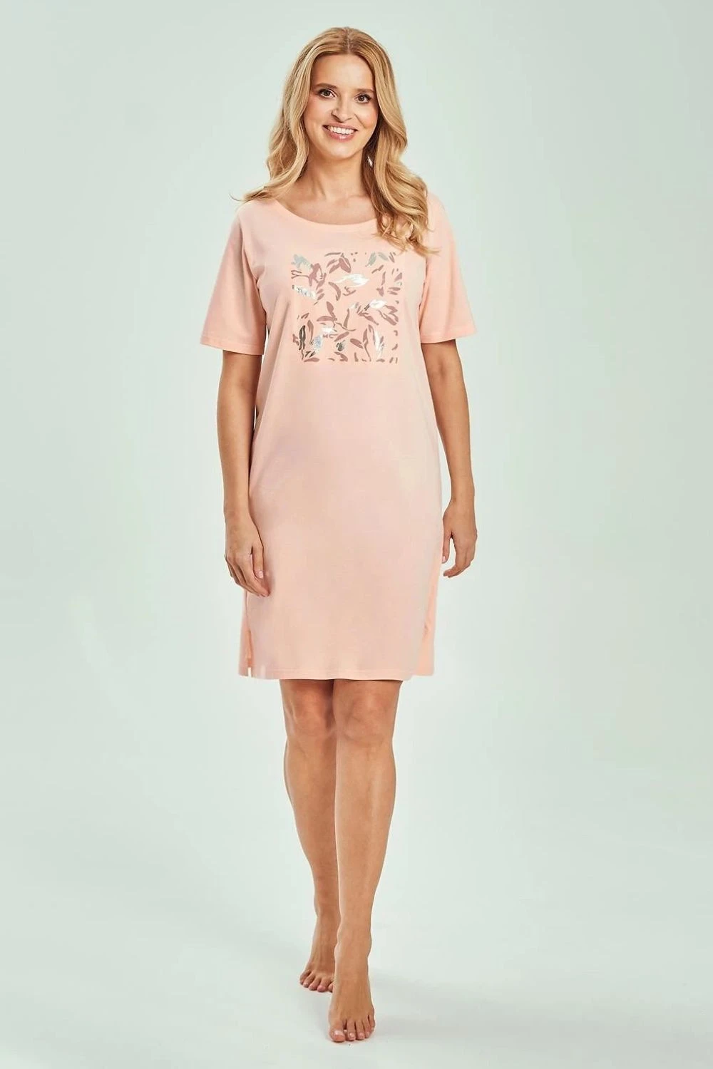 Pohodlná a ženská noční košile s potiskem, ideální pro každodenní odpočinek. Model s polo-okrouhlým výstřihem a krátkým rukávem poskytuje volnost pohybu a pohodlí při nošení. Volný, pohodlný střih jemně padne na postavu, neomezuje pohyb. Košile po kolena byla obohacena o praktické rozparky po stranách, které zvyšují pohodlí a dodávají lehkost celku. Produkt je dodáván v praktickém fóliovém sáčku, skvělý pro skladování nebo přepravu.