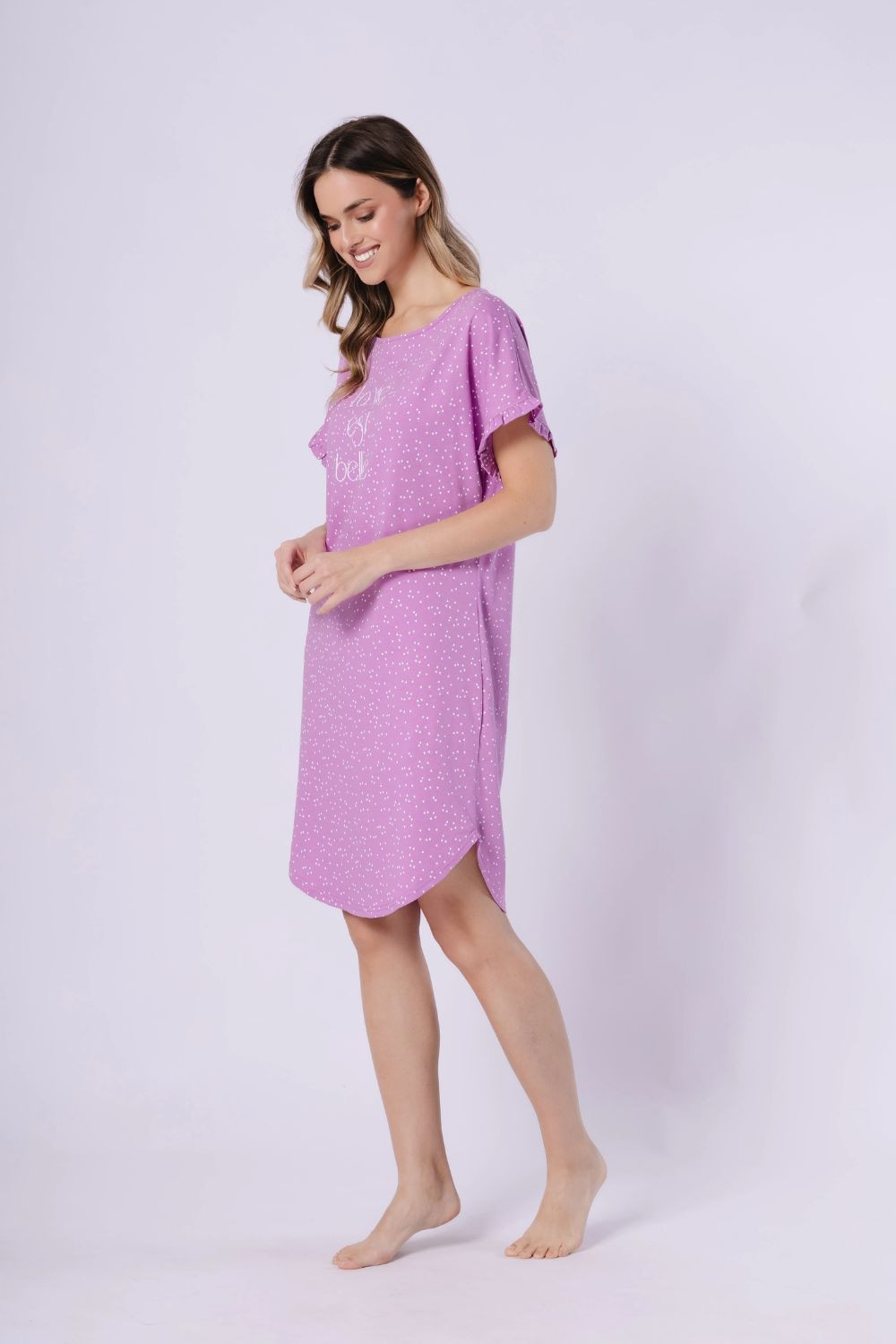 Tato roztomilá noční košile kombinuje pohodlí s jemným stylem. Má polokruhový výstřih a krátký rukáv se zakončením volánem, který jí dodává lehkost a ženský šarm. Volný, pohodlný střih a měkká a prodyšná tkanina s potiskem zajišťují volnost pohybu a radost z nošení po celou noc. Košile sahá po kolena a je dodávána v praktickém fóliovém sáčku, co ji činí také ideálním dárkem.