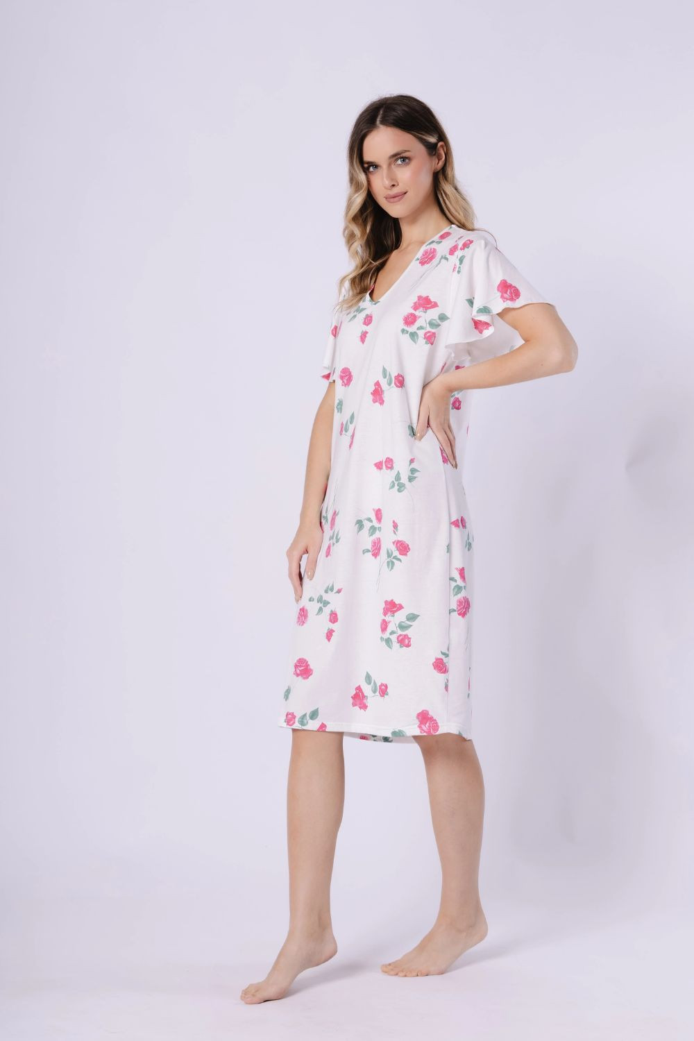 Tato noční košile spojuje pohodlí s decentním stylem. Má výstřih ve tvaru písmene V a volný, pohodlný střih, který poskytuje plnou volnost pohybu. Krátký, široký rukáv dodává lehkost a volný charakter, a měkká a prodyšná látka s potiskem zaručuje pohodlí po celou noc. Košile sahá po kolena a celý kus je balen do praktického fóliového sáčku, co z ní dělá skvělý dárek.