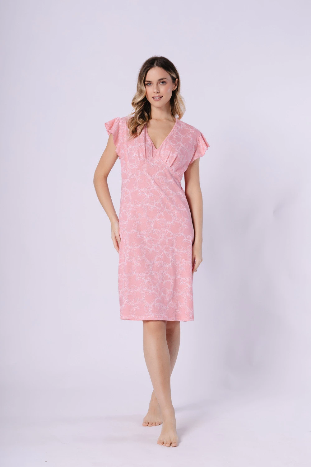 Tato noční košile je ideální volbou pro ženy, které ocení pohodlí a jednoduchou eleganci. Vykrojení ve tvaru písmene V jemně zdůrazňuje postavu, zatímco krátký rukáv poskytuje volnost a pohodlí během spánku. Model do kolen je vyroben z měkké a prodyšné látky s potiskem, která zaručuje pohodlné nošení po celou noc. Celý kus je zabalen v praktickém fóliovém sáčku, díky čemuž se tento košilka skvěle hodí i jako dárek.