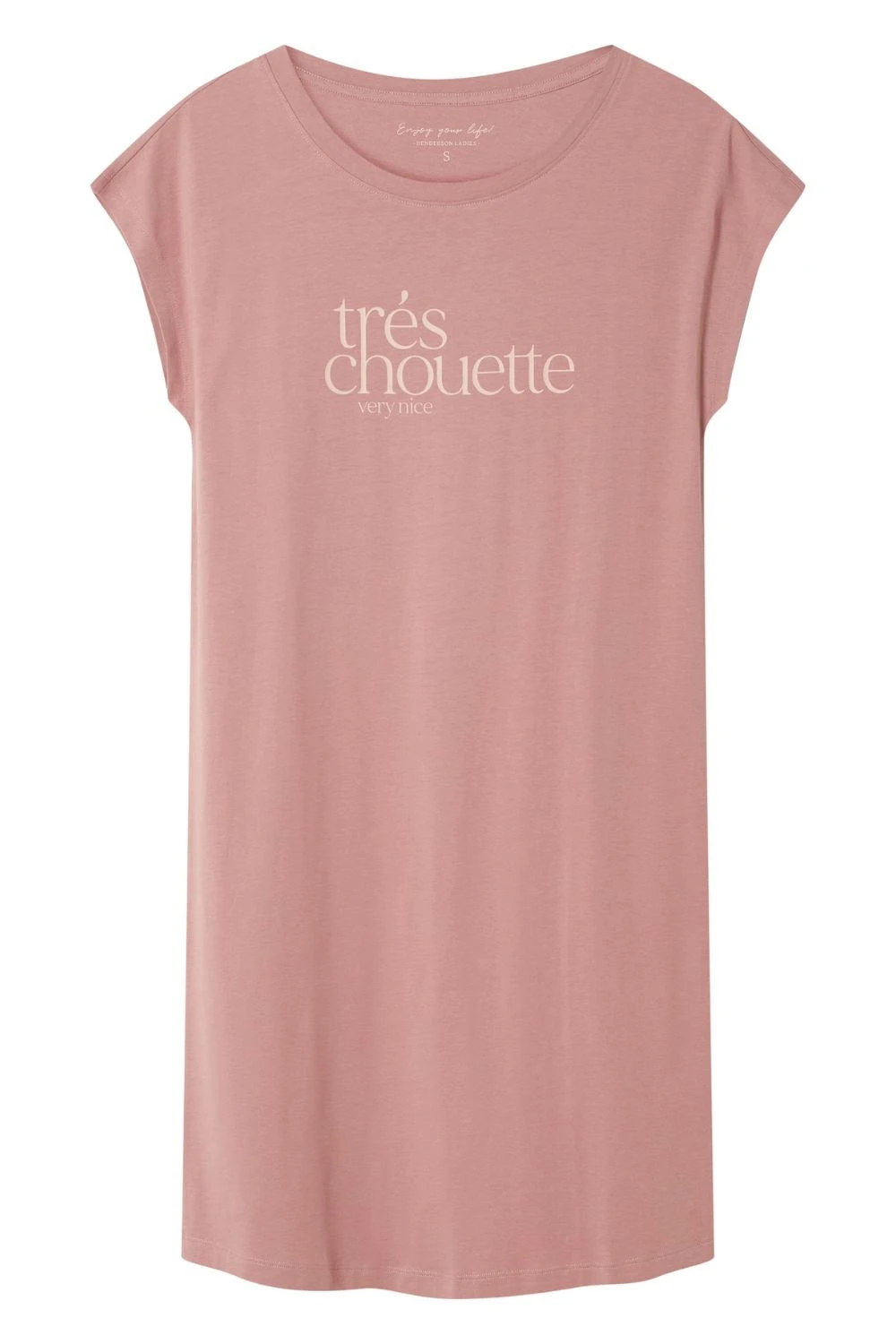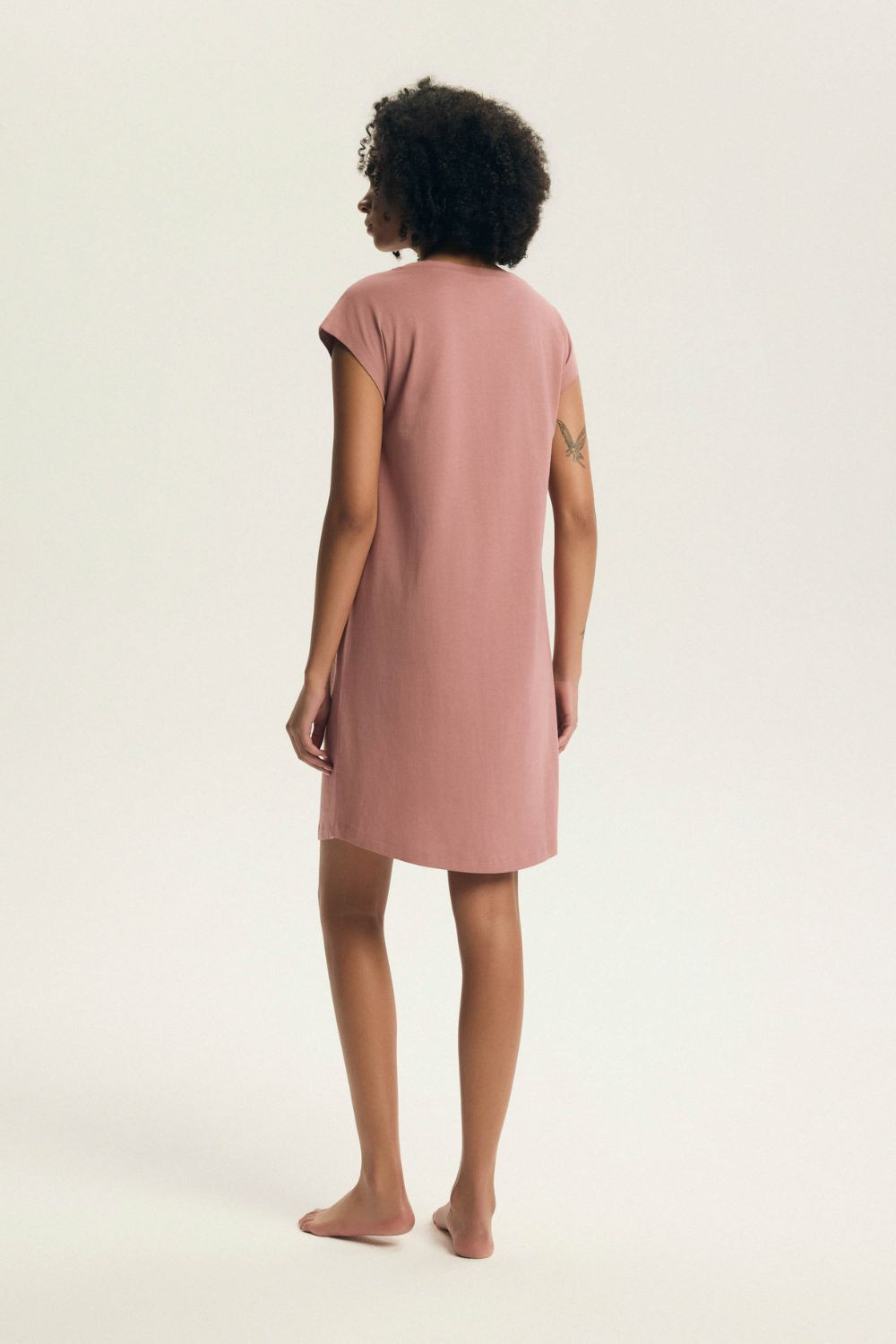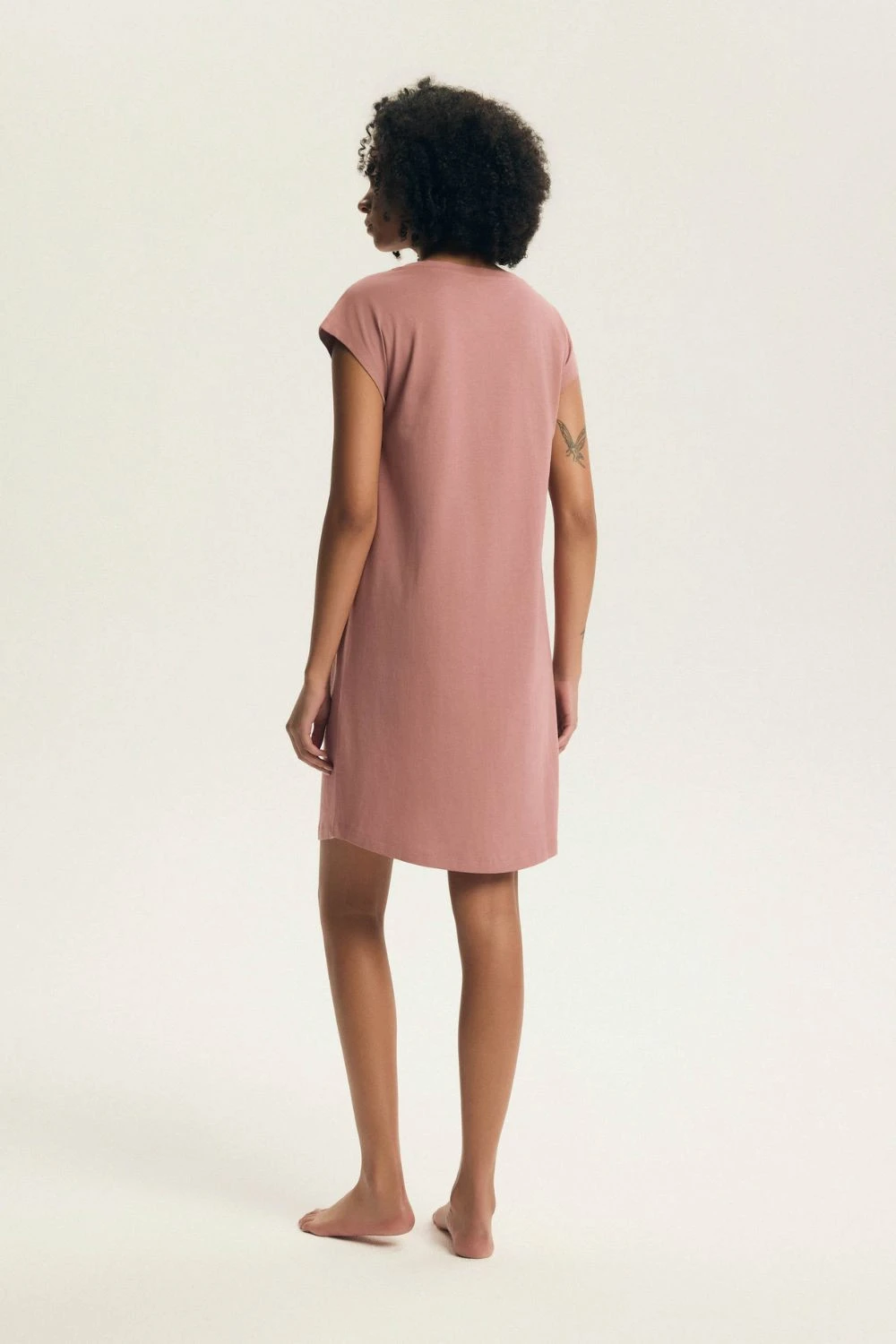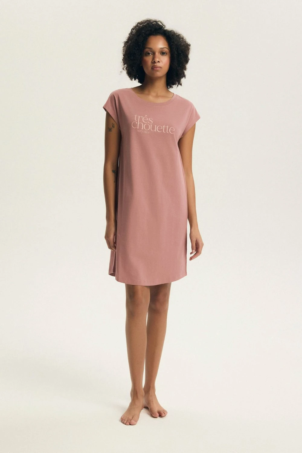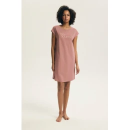 Elegantní noční košile s krátkým rukávem, kombinující pohodlí s jemným, ženským charakterem. Volný, pohodlný střih poskytuje plnou volnost pohybu a decentní barevnost dodává celku svěží a elegantní vzhled. Model má kulatý výstřih a délku po kolena, co z něj dělá lehký a pohodlný k nošení. Košile zdobená potiskem na přední straně získává moderní, atraktivní vzhled, a rozparky po stranách přidávají stylu a volnosti pohybu. Ideální volba pro ženy ocení spojení pohodlí, lehkosti a jemných detailů.