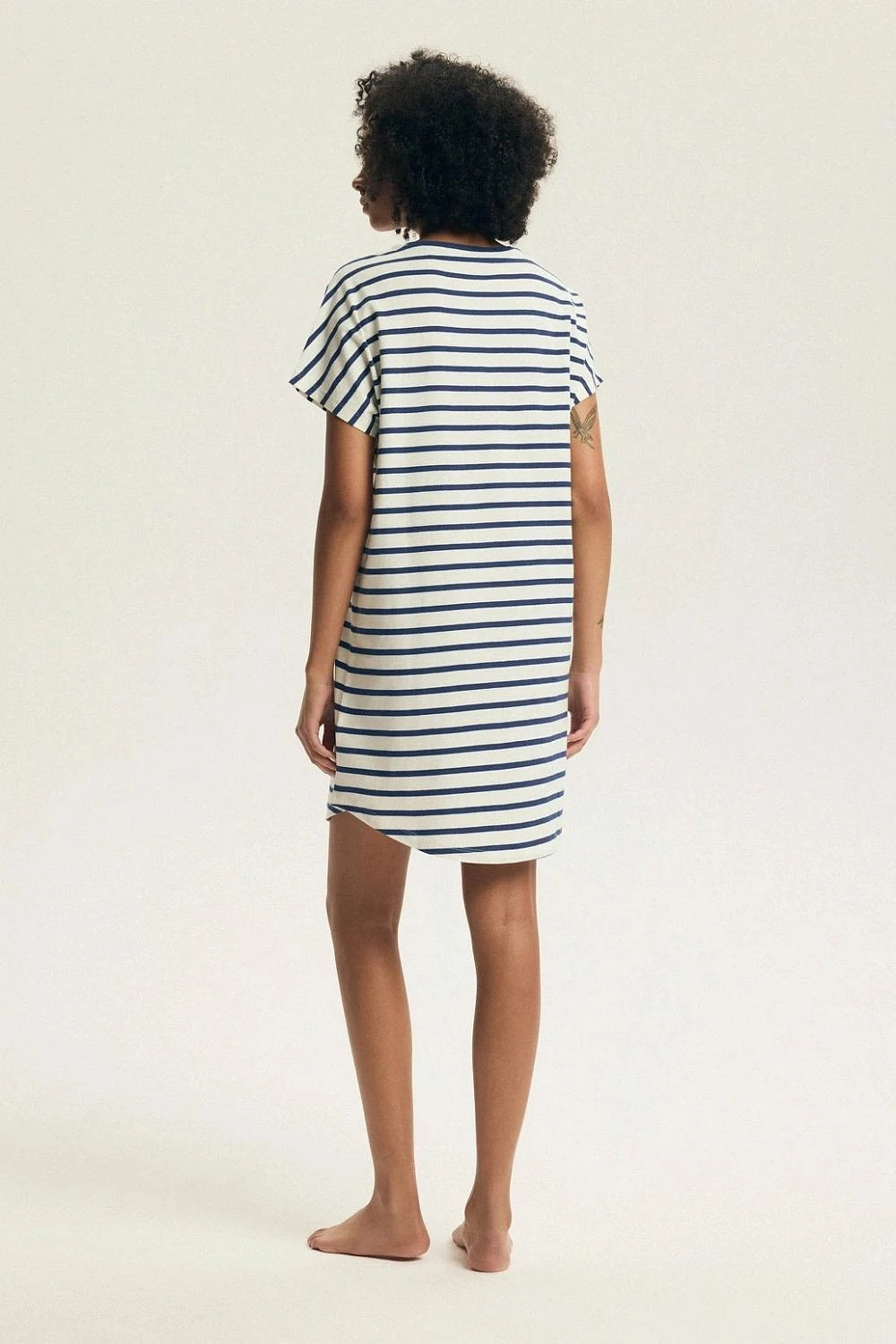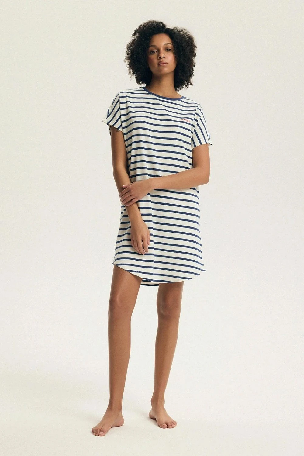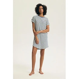 Dámská noční košile je pohodlnou a praktickou volbou pro každou noc. Volný střih poskytuje plnou volnost pohybu a jemný, prodyšný materiál zaručuje pohodlí a termální komfort po celou noc. Model má kulatý výstřih a krátký rukáv, které přidávají lehkost a volnost charakteru. Délka po kolena a polokruhový spodek dodávají košili jemnou eleganci a zároveň usnadňují pohyb. Noční košile je balena v praktickém fóliovém sáčku, co usnadňuje skladování a činí ji skvělým dárkem. Jedná se o ideální volbu pro ženy, které ocení pohodlí, jednoduchost a klasický design.