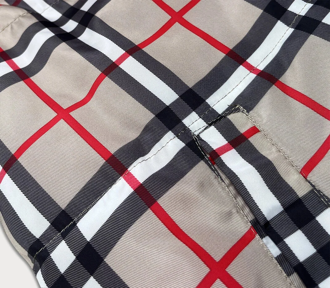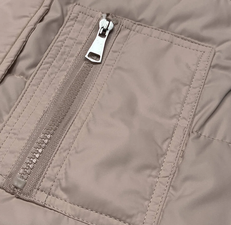 Jedna strana vesty je hladká a druhá je ozdobená károvaným vzorem burberry. Model má volný trapézový střih, stojáček, dvě kapsy bez zapínání a zapíná se zipem. Vesta má délku k bokům. Spodní okraj modelu je půlkulatý a přední část vesty je o něco kratší než zadní.