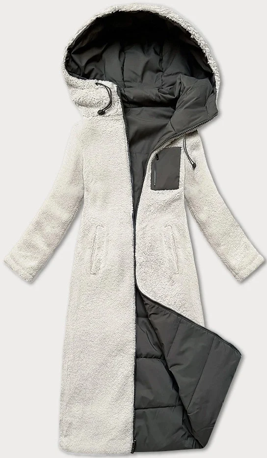 Jedna strana bundy je prošívaná a druhá je typu "beránek". Bunda je lehce vypasovaná, je zateplená syntetickou péřovou výplní, má dvě kapsy a zapíná se dvousměrným zipem. Model má kapuci, kterou není možné odepnout. Bunda má délku do poloviny lýtek.