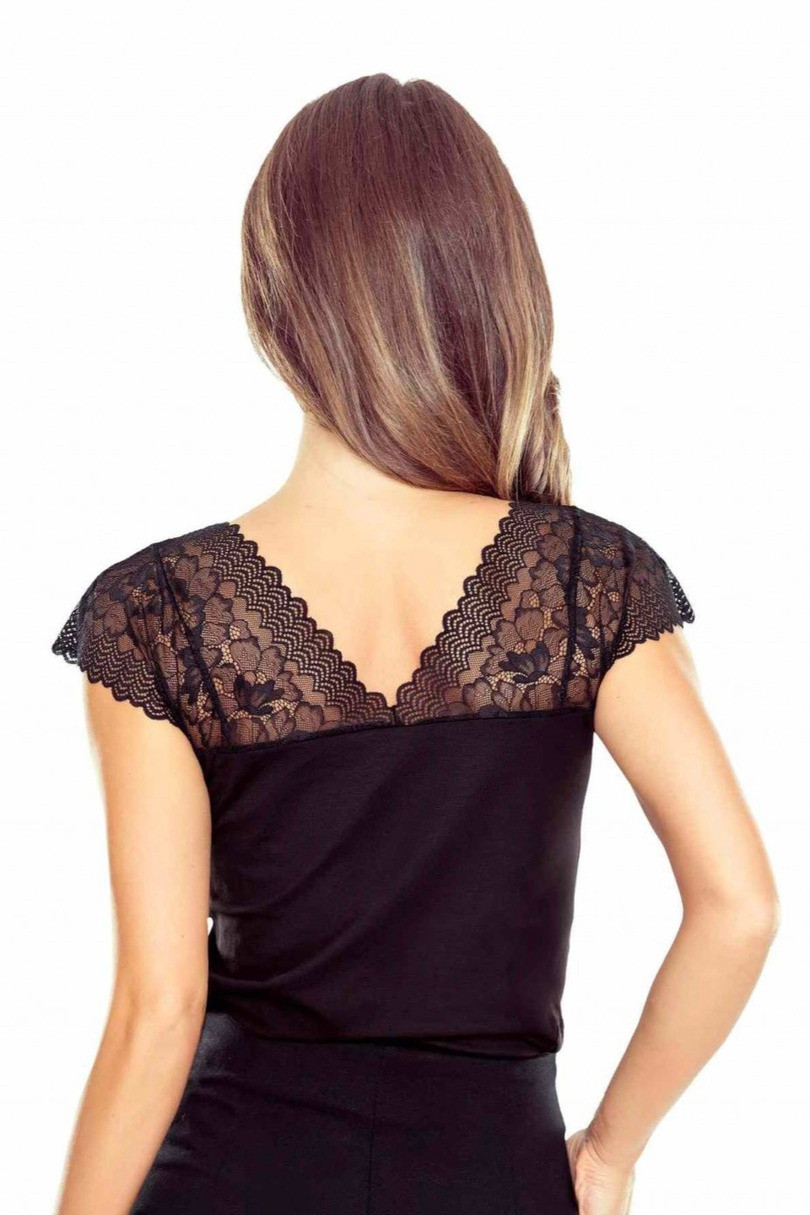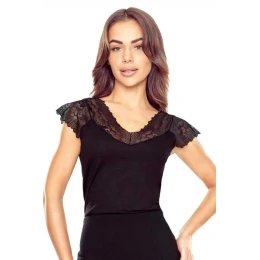 Bluzka Odina czarna marki ELDAR to esencja kobiecości i elegancji zamknięta w ponadczasowej czerni. Model zachwyca subtelnymi detalami, które nadają całości wyjątkowego, zmysłowego charakteru. Dekolt w kształcie litery V oraz ramiona zostały wykonane z delikatnej koronki o kwiatowym wzorze, która pięknie podkreśla górną część sylwetki i dodaje stylizacji lekkości. Bluzka została uszyta z wysokiej jakości, elastycznego materiału na bazie wiskozy, który zapewnia komfort noszenia i idealne dopasowanie do ciała. Krótkie, koronkowe rękawki typu cap subtelnie eksponują ramiona, zachowując jednocześnie elegancki i klasyczny wygląd. Dopasowany krój sprawia, że model Odina doskonale prezentuje się zarówno w stylizacjach wieczorowych, jak i podczas randki czy eleganckiego spotkania. To must-have w garderobie każdej kobiety cenEAN čárové kódy zboží jsou: