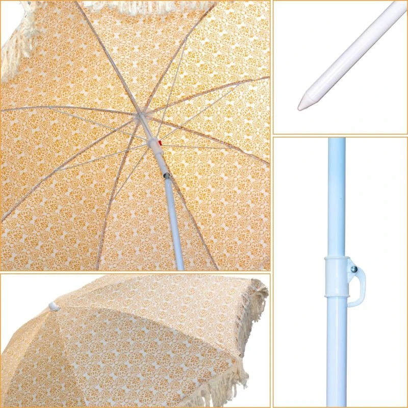 Parasol plażowo-ogrodowy z frędzlami świetnie sprawdzi się zarówno na plaży, w ogrodzie, jak i na tarasie czy balkonie. Jego kompaktowy rozmiar oraz regulowana konstrukcja umożliwiają łatwe dopasowanie do różnych miejsc i sytuacji. Niezależnie od tego, gdzie spędzasz czas – zawsze zapewni Ci stylową ochronę przed słońcem.
