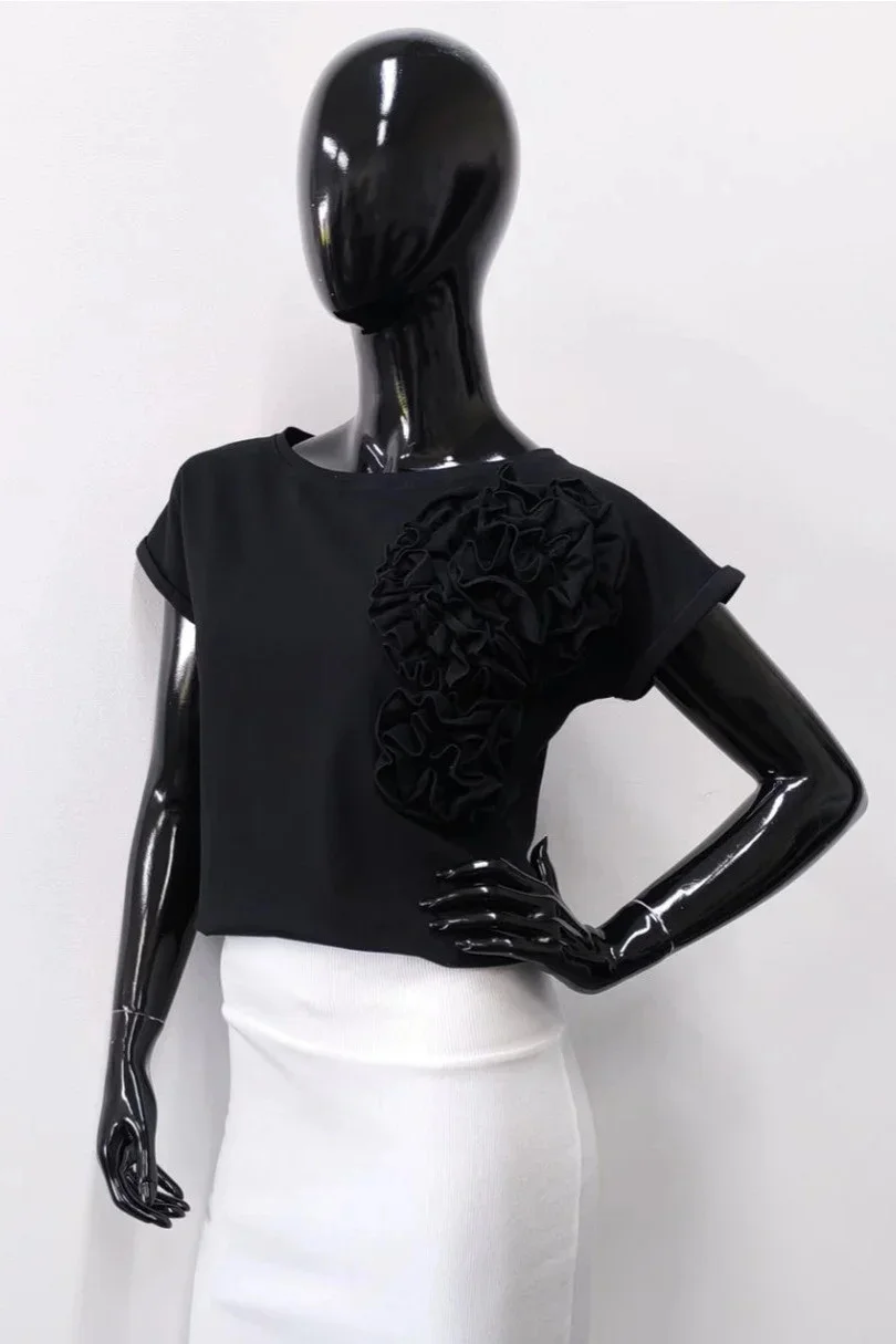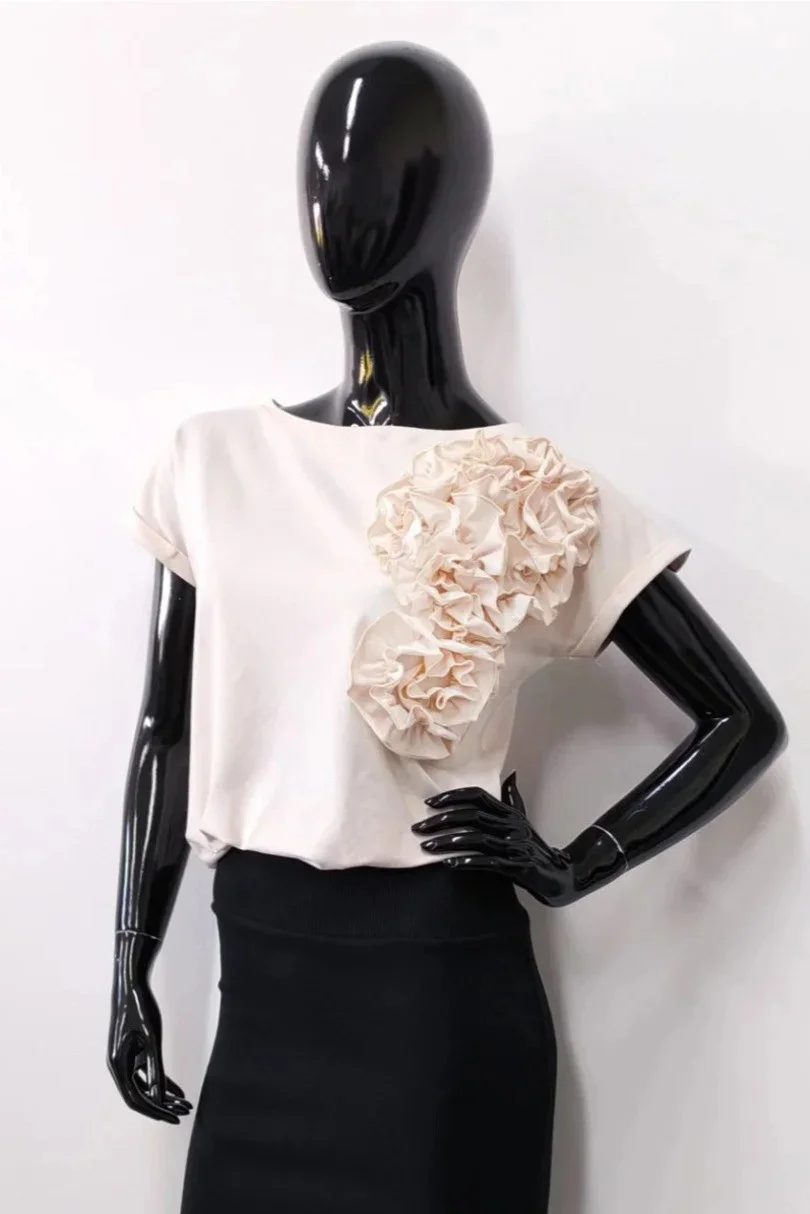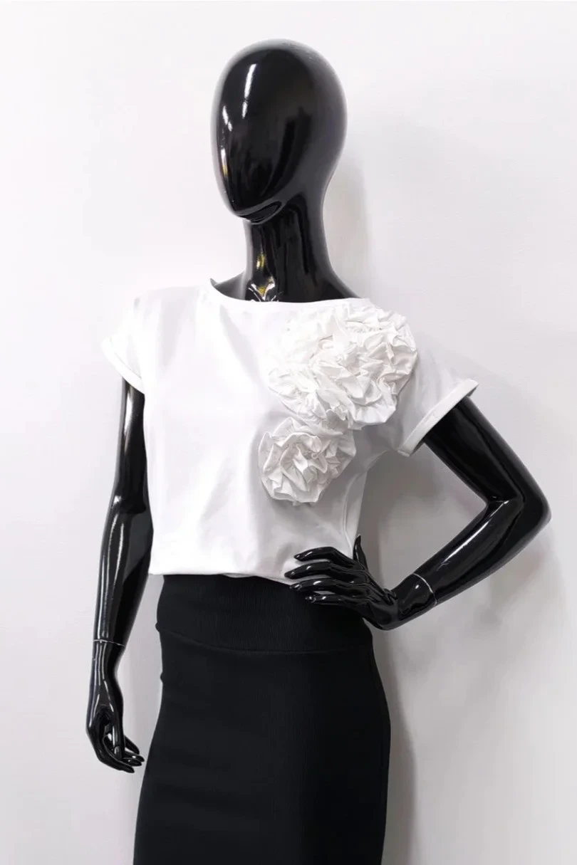 Dodaj do swojej garderoby nutę elegancji i kobiecego uroku dzięki tej wyjątkowej bluzce damskiej z krótkim rękawem. Jej klasyczny krój z nowoczesnym akcentem – wywijany rękaw i wydłużony, lekko zaokrąglony tył – sprawia, że idealnie sprawdzi się zarówno na co dzień, jak i w bardziej formalnych stylizacjach. Prawdziwą ozdobą są przestrzenne kwiaty 3D, które nadają całości modnego i oryginalnego charakteru. Wykonana z miękkiej, oddychającej bawełny z dodatkiem elastanu, gwarantuje komfort noszenia i dopasowanie do sylwetki.