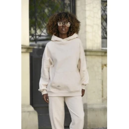 Ta damska bluza z kapturem to idealne połączenie stylu, komfortu i funkcjonalności. Wykonana z grubego, ocieplanego materiału od spodu, zapewnia przyjemne ciepło nawet w chłodniejsze dni. Dzięki praktycznej kieszeni kangurce możesz ogrzać dłonie lub przechować drobiazgi, a ściągacze na dole i przy rękawach gwarantują doskonałe dopasowanie do sylwetki. Bluza świetnie sprawdzi się podczas spaceru, treningu, zakupów czy domowego relaksu. Wysokiej jakości materiał (90% bawełna, 10% poliester) zapewnia trwałość i wygodę noszenia na co dzień.