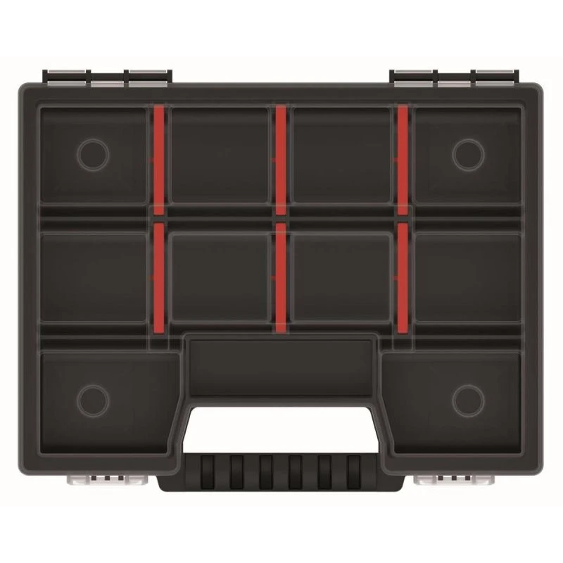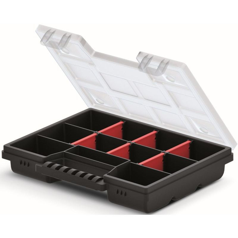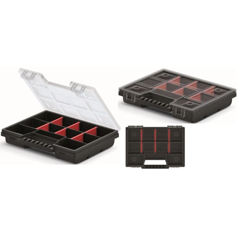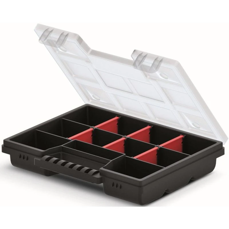Oragnizer má 6 vyjímatelných přihrádek, takže můžete velikost a počet komor přizpůsobit typu a velikosti ukládaného nářadí, a praktické průhledné víko vám umožní vidět věci, aniž byste museli víko otevírat.