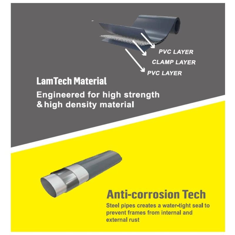 Stěny bazénu jsou vyrobeny z vysoce kvalitního trojitě laminovaného PVC, které je odolné proti oděru, UV záření a mechanickému poškození, takže si můžete bazén užívat po mnoho sezón bez obav o jeho životnost. Dokonalá kombinace odolnosti a pohodlí.