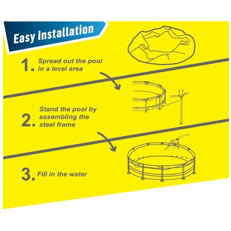 Sestavení bazénu je velmi snadné a nevyžaduje žádné speciální nářadí. Ocelový rám a sloupky se rychle spojí a vytvoří stabilní konstrukci pro bezpečné a pohodlné používání. Během okamžiku je připraven k naplnění vodou!