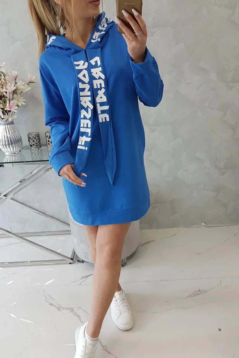 Představujeme vám módní šaty. Šaty mají kapuci. Šaty mají potisk na kapuci a na šerpě vpředu. Ideální každodenní poloha. Šaty jsou vyrobeny z vysoce kvalitního materiálu. Velikost je univerzální a vyhovuje dámám, které nosí velikost M, L nebo XL