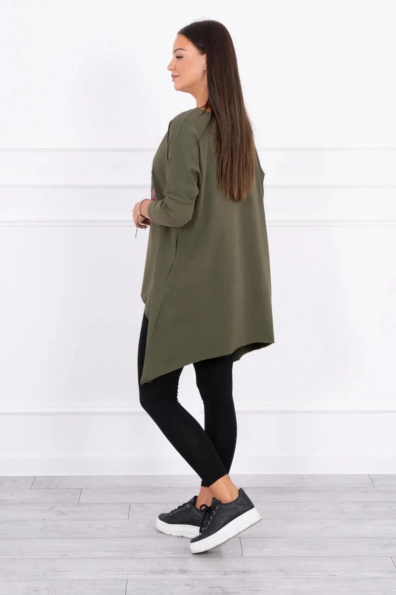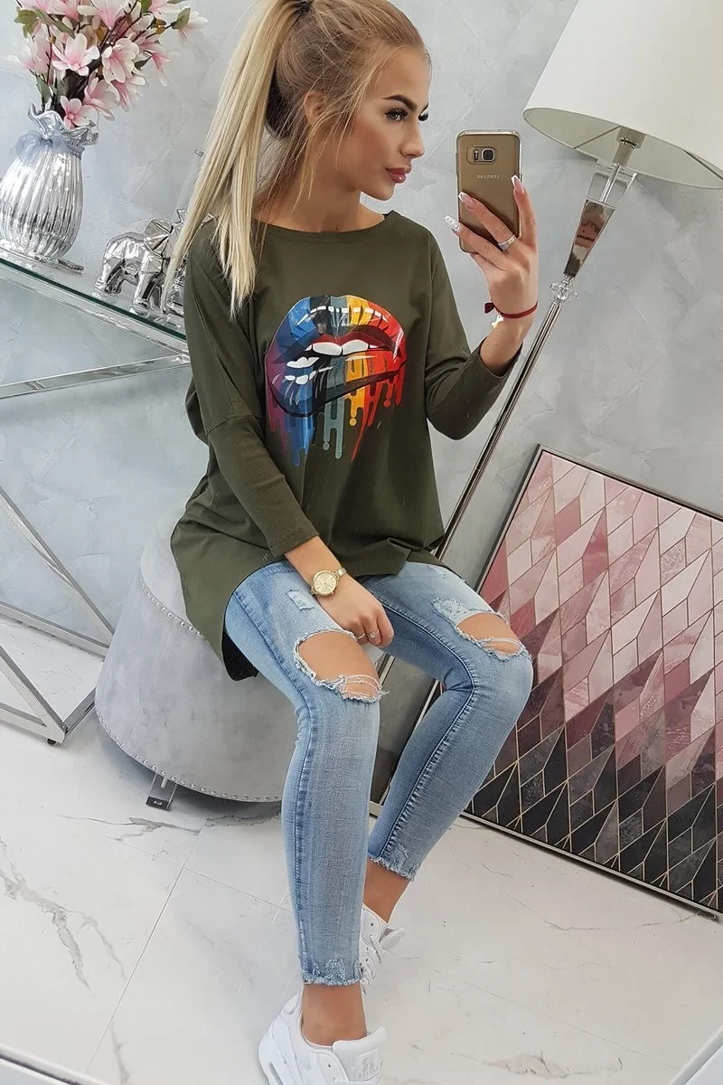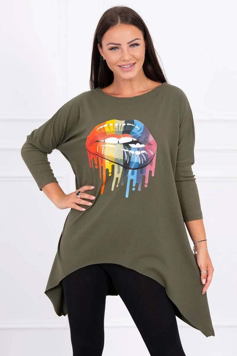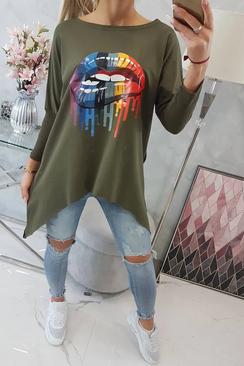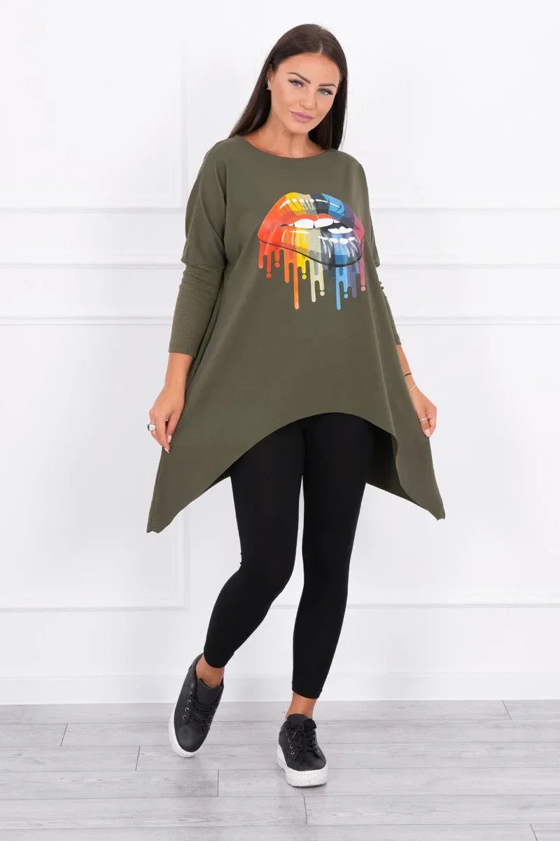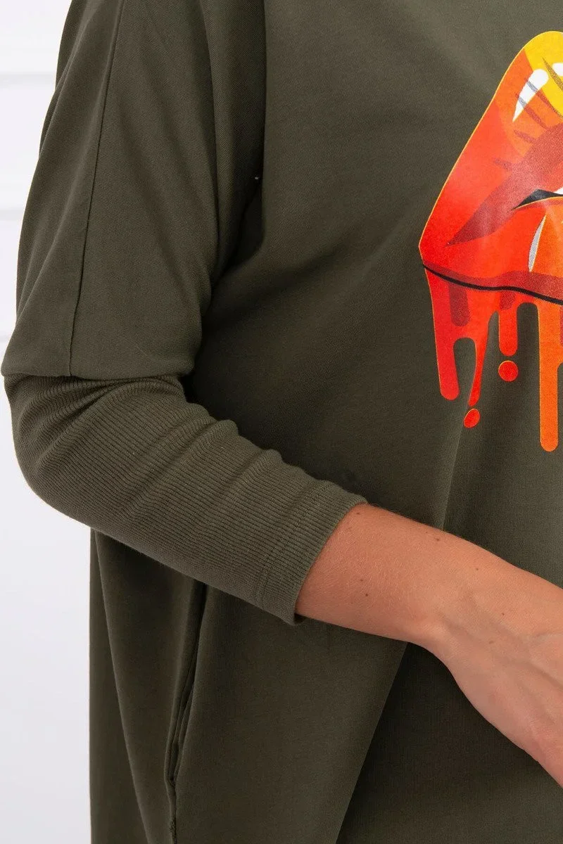 Oversize halenka s model 18743442 potiskem rtů v barvě khaki - K-Fashion