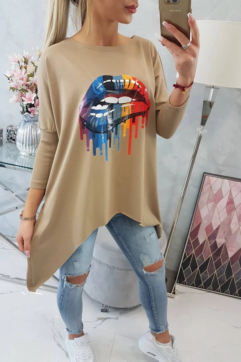 Představujeme vám super oversize halenku. Halenka má na přední straně potisk zobrazující rty v barvách duhy. Halenka s kapsami. Tato halenka se vyznačuje módním designem a precizním zpracováním. Ve vašem šatníku rozhodně nesmí chybět. Halenka je vyrobena z vysoce kvalitního materiálu. Univerzální velikost je vhodná pro dámy, které nosí každodenní oblečení ve velikostech M, L nebo XL