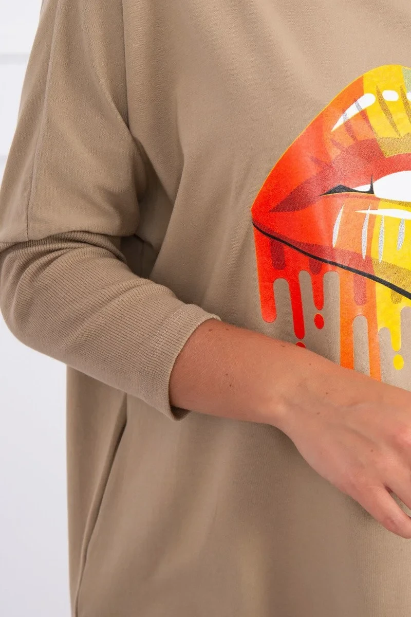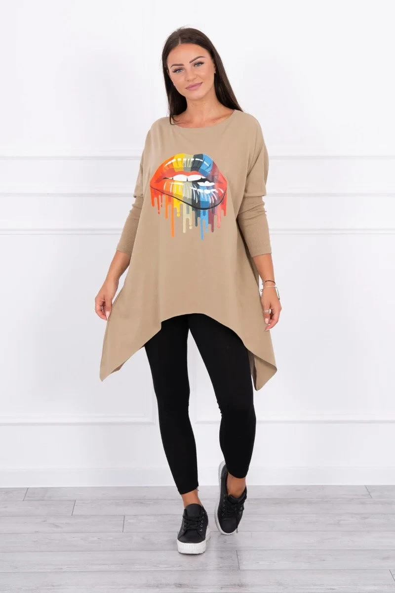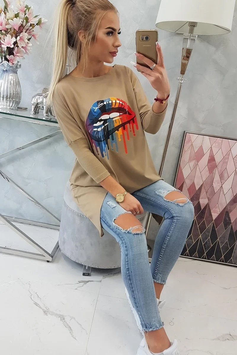 Oversize halenka s potiskem model 18743426 rtů camel - K-Fashion