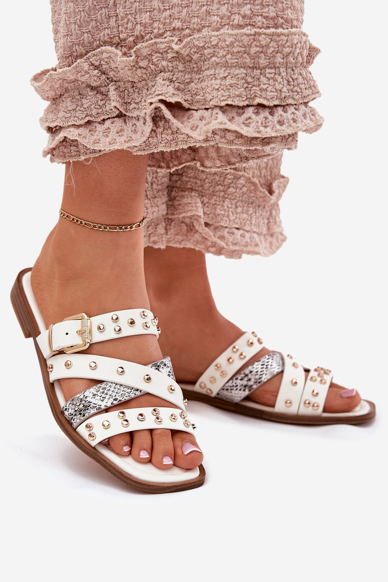 Ozdobené dámské sandály na plochém podpatku s pásky a sponou bílé Manitte