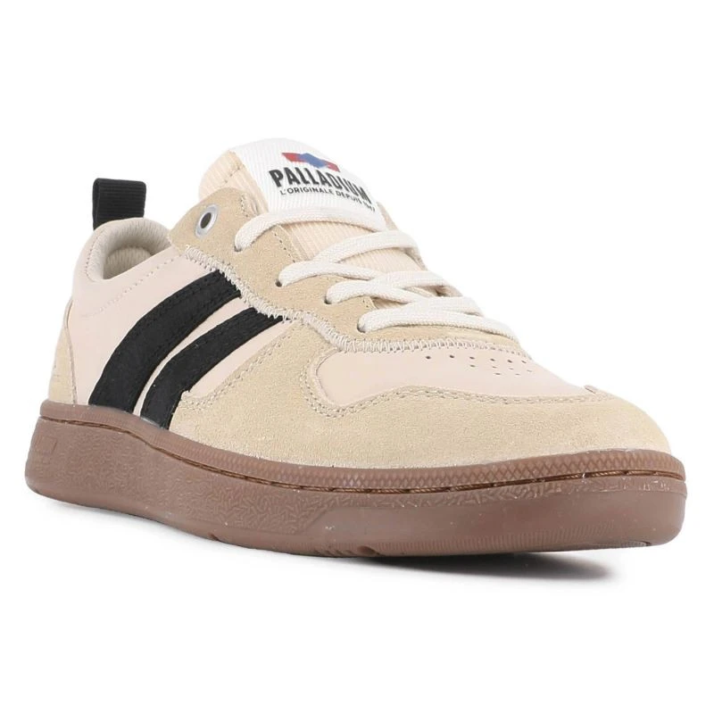 Palladium Pallacup Flame OG 74484-102-M Almond Milk / Black je unisex model inspirovaný 70. a 80. lety, který kombinuje retro estetiku s moderním pohodlím. Svršek je vyroben převážně ze semiše, s prvky imitace kůže, které dodávají kontrast a styl. Vnitřek boty a stélka jsou vyrobeny z tkaniny, měkké a šetrné k noze. Gumová podrážka zajišťuje dobrou přilnavost a odolnost. Model má nízký profil ("low cut") a klasické šněrování pro snadné nazouvání. Dominantní barva "Almond Milk" a detaily v černé barvě vytvářejí klidný, ale výrazný komplet, který se hodí jak pro ležérní, tak streetwearové stylizace.