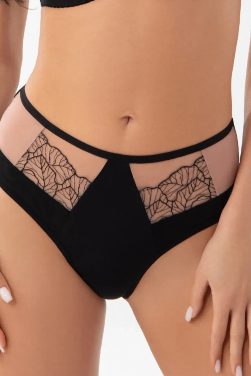 Średni stan. Odsłaniają i podkreślają pośladki. Wykonane z microfibry połączonej z elastycznym tiulem oraz haftem podbitym tiulem stabilnym.Tył to połączenie czarnego i transparentnego tiulu tworzące fantazyjny kształt. Tył z tiulu elastycznego wykończony na gładko, tak aby majtki nie odznaczały się pod ubraniem. Bawełniany kroczek.